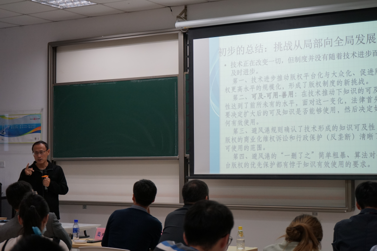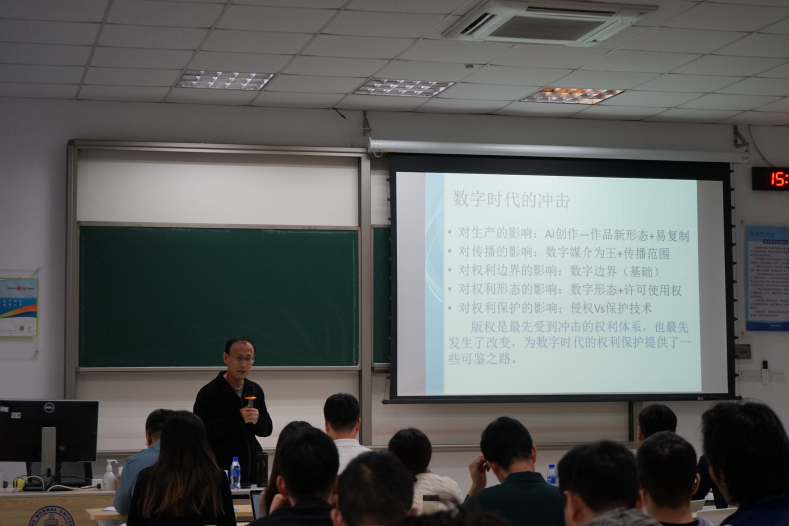 首先,魏建教授以版权的特殊性和数字时代对版权体系的冲击为切入点,向在座师生分享了版权的特征。他指出,知识生产由三方面决定,分别是创作者的创意、可利用知识的存量以及创作者可以得到的激励。版权作为知识产权的一种,具有大规模性、无形性等特征,是数字时代最先受到冲击且最先发生改变的权利体系,这为数字时代的权利保护提供了范本。