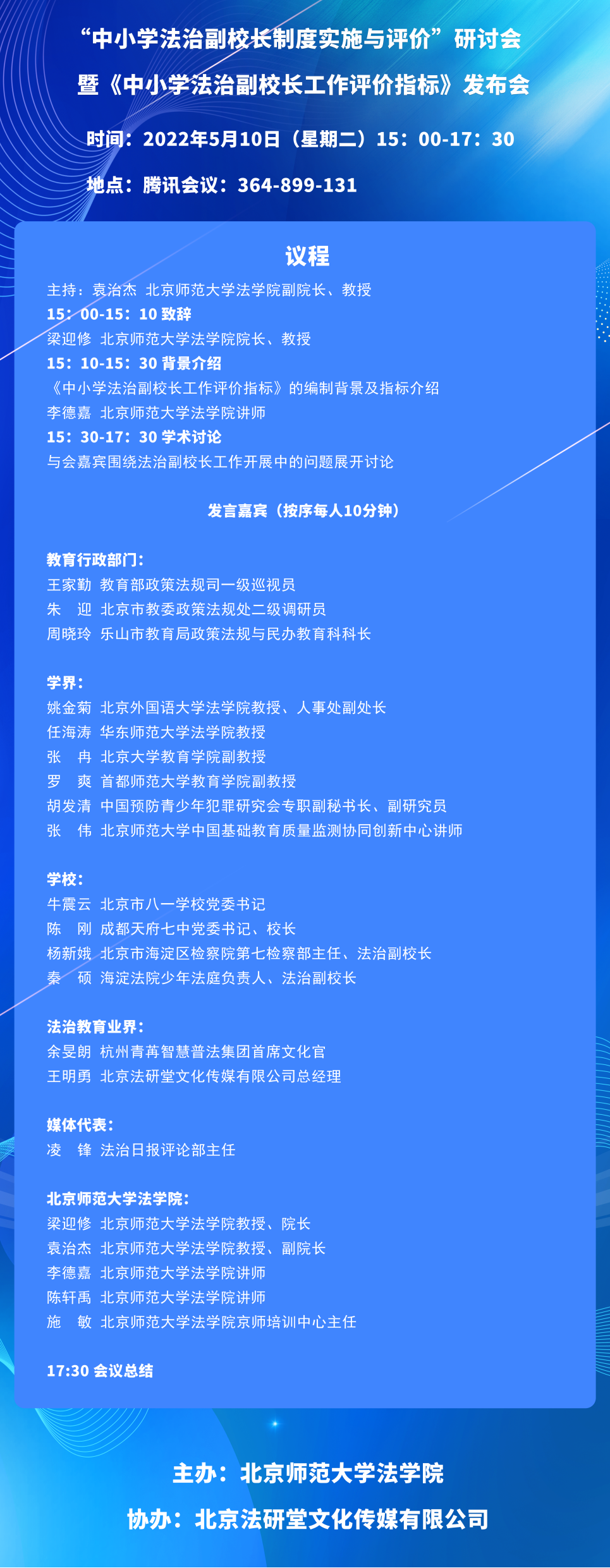 5月10日下午,由cn影院 主办、北京法研堂文化传媒有限公司协办的“中小学法治副校长制度实施与评价”研讨会暨《中小学法治副校长工作评价指标》发布会在腾讯会议线上召开。来自教育部政策法规司、北京市教委政策法规处、乐山市教育局政策法规与民办教育科、北京外国语大学、华东师范大学、北京大学、首都师范大学、中国预防青少年犯罪研究会、北京市八一学校、成都天府七中、盐城市第一中学、北京市海淀区检察院、海淀法院少年法庭、杭州青苒智慧普法集团、北京法研堂文化传媒有限公司、法治日报评论部、cn影院 等单位的二十余位发言嘉宾和来自全国各地的一百余位与会嘉宾参加了本次会议。