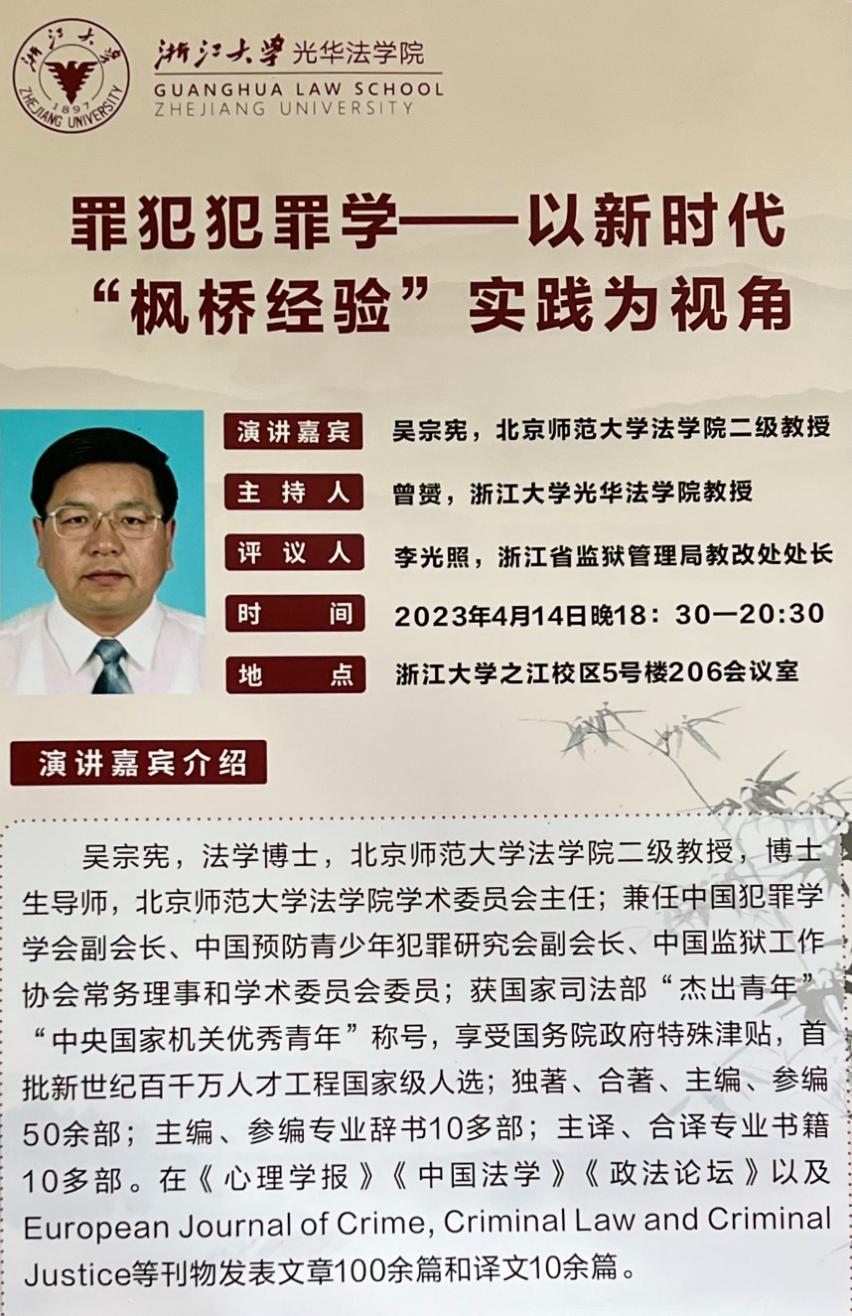 晚上18:30,吴宗宪教授在该cn影院 做了题目为《罪犯犯罪学——以“枫桥经验”实践为视角》的讲座。讲座由该院曾赟教授主持。浙江大学光华cn影院 的同学、张崇脉教授和在该校接受培训的刑事司法机构官员聆听了讲座。