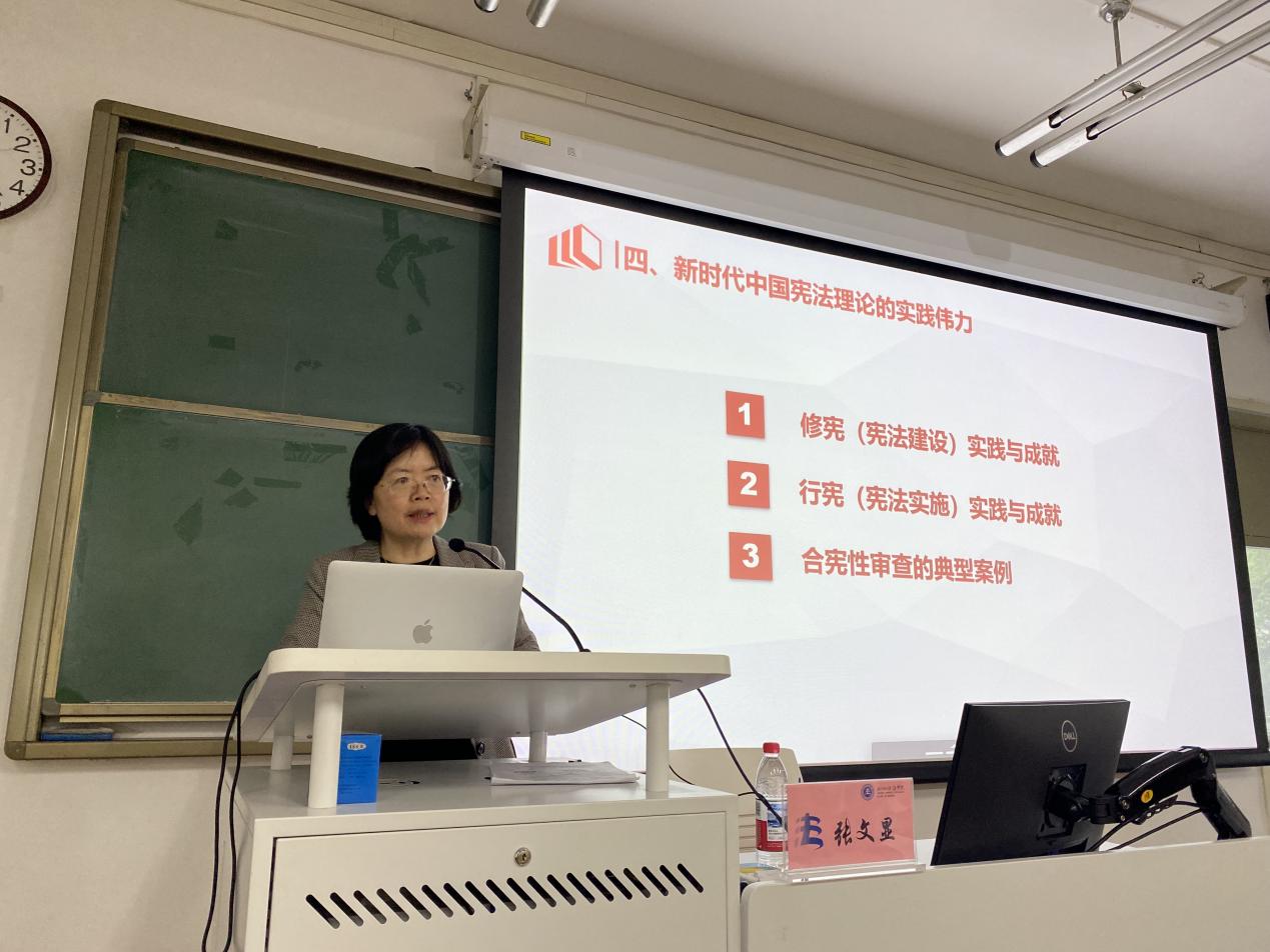 张文显教授在讲座中首先深入阐释了新时代中国宪法理论的核心要义和主要理论板块,核心要义集中体现在15个方面的重要论述,主要理论板块则包括宪法文明论、宪法本体论、宪法价值论、宪法制度论、宪法实践论、宪法学的认识论和方法论等。随后,张文显教授明确指出,新时代中国宪法理论深刻揭示了近代以来中国宪法发展的历史逻辑,深刻阐述了依宪治国、依宪执政的理据和内涵。他讲述了新中国立宪、修宪、行宪的故事,阐述了“两个首先要”的法理逻辑和科学内涵,分析了依宪治国、依宪执政与西方“宪政”的本质区别,内容深刻而生动。最后,张文显教授结合新时代中国宪法建设和实施的实践与成就、合宪性审查的典型案例,对新时代中国宪法理论的实践伟力做了精辟的阐释。本次讲座内容丰富、深入浅出、引人入胜,赢得了在场师生的热烈掌声。