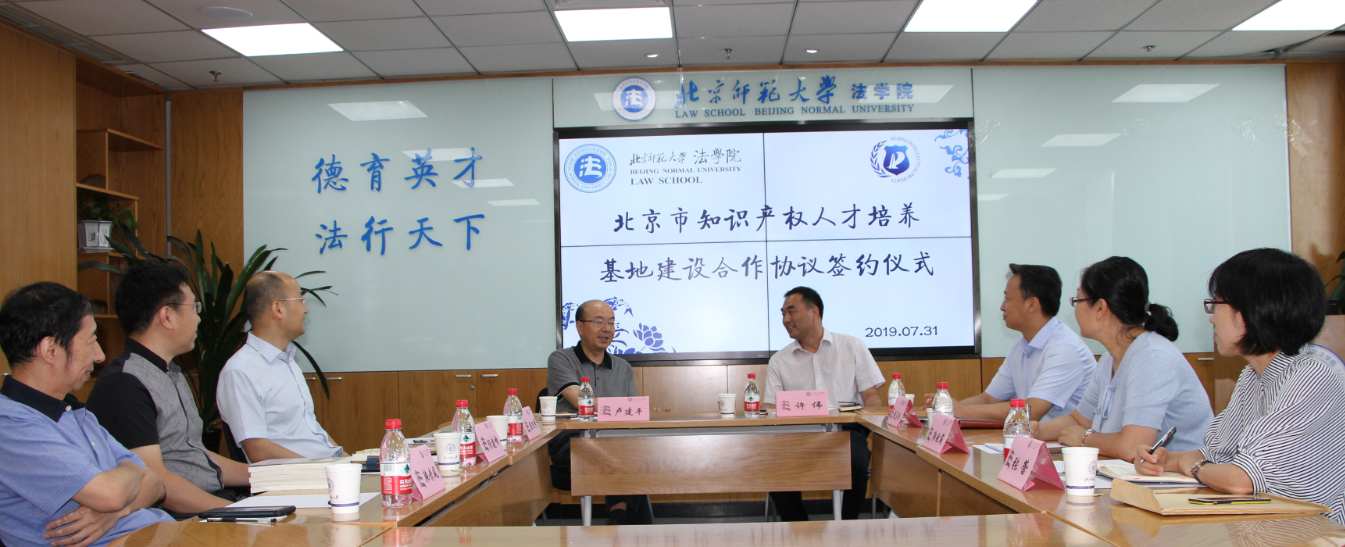 2019年7月31日上午,cn影院 与北京市知识产权局在cn影院 1922会议室成功举办了北京市知识产权人才培养基地建设合作协议签约仪式。北京市知识产权局许伟副局长、张志豹处长、郭晓萌同志和张蕾同志,cn影院 院长卢建平教授、党委书记梁迎修教授、副院长阴建峰教授、民商事法学教研中心主任韩赤风教授出席了签约仪式。