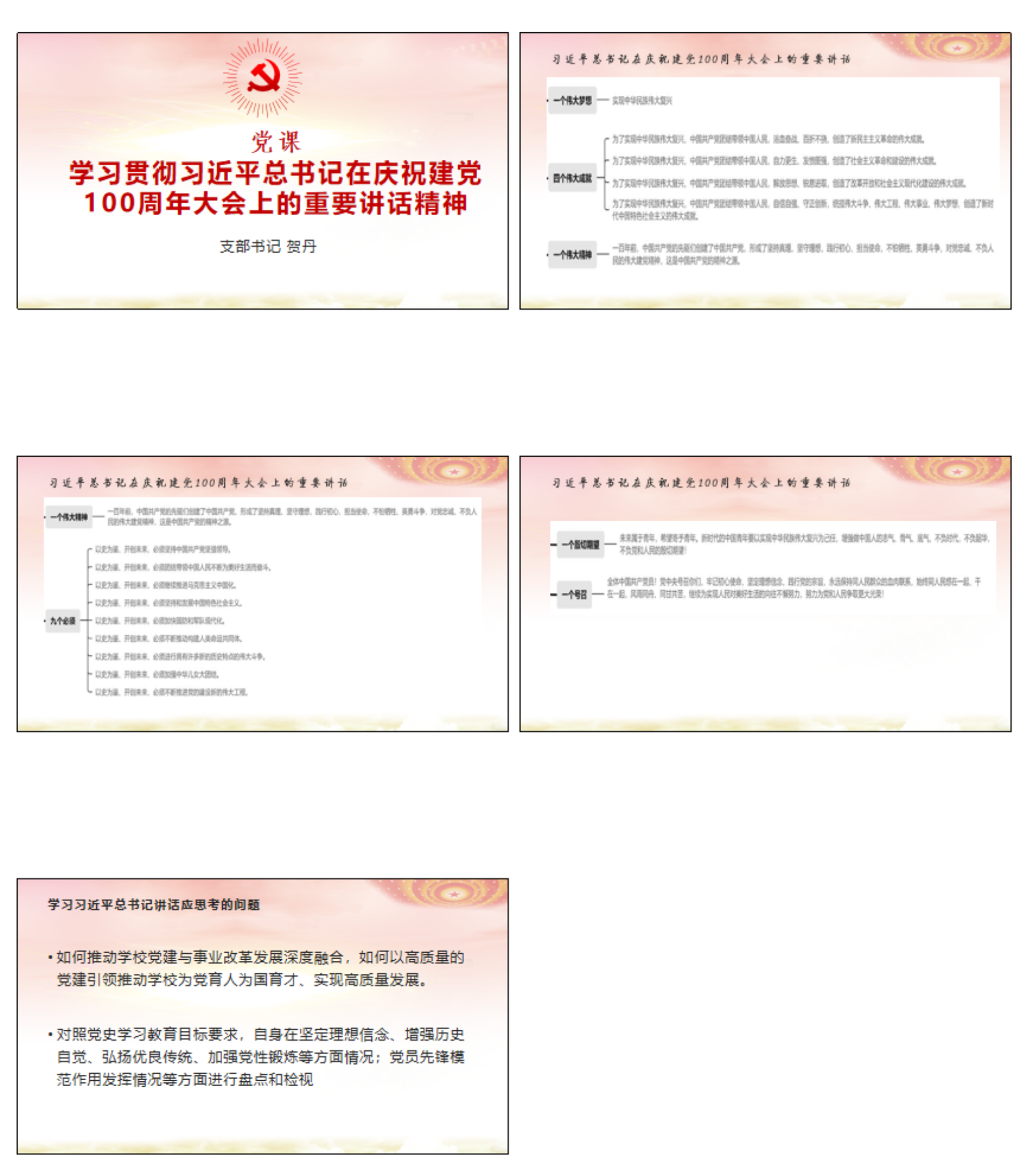 会上,支部书记贺丹以学习习近平总书记“七一”重要讲话精神讲了党课,提出要全面学习贯彻习近平总书记在庆祝建党100周年大会上的重要讲话精神,牢记初心使命,坚定理想信念,践行党的宗旨。同时,党员要结合学校和本单位实际,研究探讨如何推动学校党建与事业改革发展深度融合,如何以高质量的党建引领推动学校为党育人为国育才、实现高质量发展。另外,要对照党史学习教育目标要求,自身在坚定理想信念、增强历史自觉、弘扬优良传统、加强党性锻炼等方面情况;党员先锋模范作用发挥情况等方面进行盘点和检视。