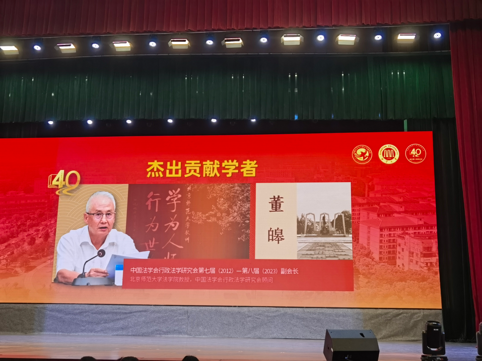 2025年10月18日上午,中国法学会行政法学研究会2025年年会在湖南湘潭隆重召开。本次年会由中国法学会行政法学研究会主办、湘潭大学承办。全国人大常委会、最高人民法院、最高人民检察院、司法部等部门的领导,来自北京大学、清华大学、中国人民大学、中共中央党校(国家行政学院)等高校和科研机构的专家学者等500余人齐聚一堂,共襄盛举,回顾四十年辉煌历程,共绘新时代行政法治发展蓝图。大会宣读并表彰了中国行政法学“终身成就学者”、中国行政法学“杰出贡献学者”,颁发了“从事行政法教研四十年”荣誉证书,宣布了“中国行政法学四十年优秀成果”“2025年年会优秀论文”,颁发了第十二届“应松年行政法学奖学金”。其中,cn影院 董皞教授荣膺中国行政法学“杰出贡献学者”称号。