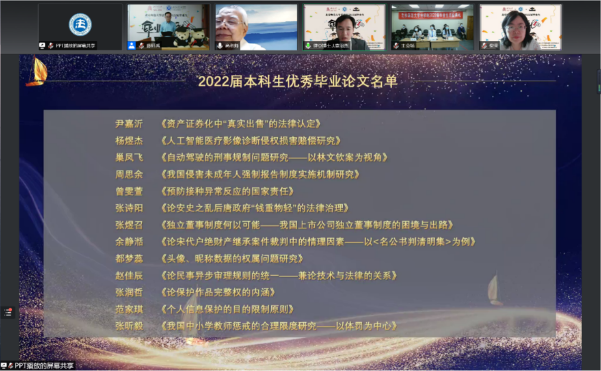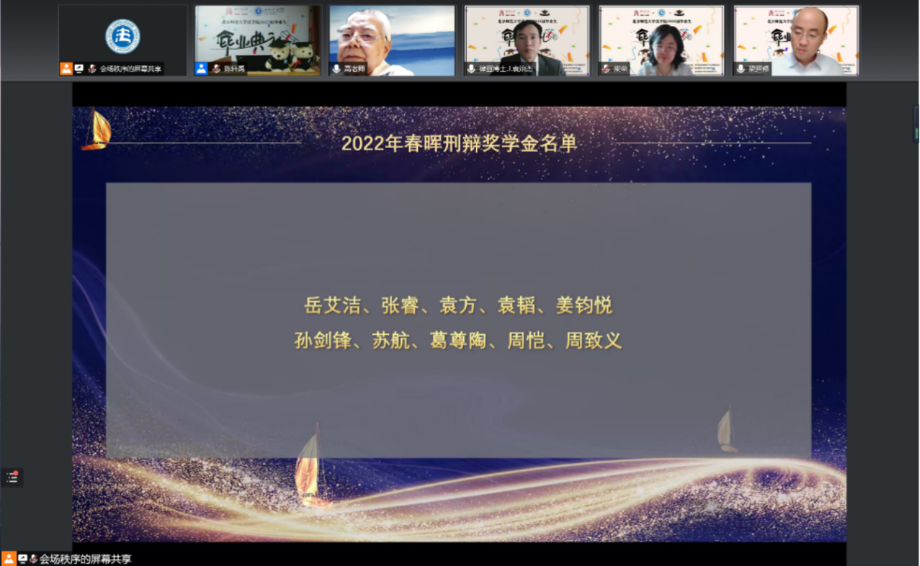 线上出席典礼的嘉宾有:cn影院 刑事法律科学研究院名誉院长高铭暄教授、cn影院 宋英辉教授、春晖刑辩奖学金捐赠人赵春雨律师、校友代表全国法院先进个人、北京市高级人民法院蔡秀法官、cn影院 院长梁迎修教授,cn影院 党委书记、副院长柴荣教授、cn影院 副院长阴建峰教授、cn影院 副院长、2019级法硕3班班主任李滨教授、cn影院 副院长袁治杰教授、刑事法律科学研究院副院长何挺教授、cn影院 工会主席严厚福副教授、cn影院 劳佳琦副教授、cn影院 2019级博士1班班主任汪庆华教授、cn影院 2019级博士2班班主任贾济东教授、cn影院 2019级学硕2班班主任商浩文副教授、cn影院 2018级本科瀚德实验班班主任贾婉婷老师、cn影院 2018级本科卓越实验班班主任马丽亚老师、cn影院 2019级法硕2班班主任祁书峰老师,cn影院 黄晓亮教授,cn影院 张磊教授,cn影院 刘科副教授,cn影院 贺丹副教授,cn影院 杨雄副教授,cn影院 赵晨光副教授,cn影院 李潇潇老师,cn影院 郭晔老师,cn影院 李迪老师、cn影院 施敏老师以及其他线上参加本次毕业典礼的老师。