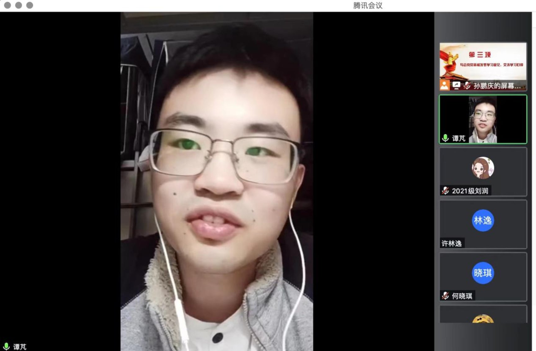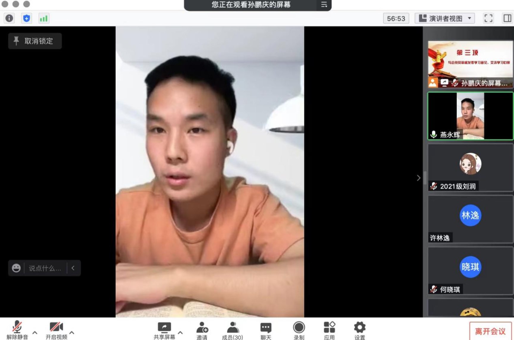 5月27日晚19:00,为进一步深入学习习近平总书记在中国人民大学考察时的重要讲话精神,cn影院 2021级学硕第二党支部联合cn影院 教工第三党支部,以支部书记讲党课和师生党支部共同交流学习为形式,共同开展支部书记讲党课暨师生党支部共建主题党日活动。受疫情影响,本次活动以线上腾讯会议的方式进行。本次会议由2021级学硕第二党支部书记孙鹏庆主持,师生党员共计近40人参加本次会议。