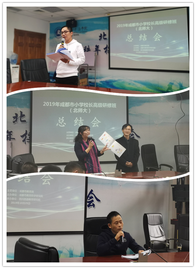 24日下午,2019年成都市教育局小学校长高级研修班总结交流会如期召开,五位学员代表就几天来的培训学习体会和收获进行总结分享。学员们均表示在cn影院 的收获颇丰,尤其是多种学习方式并行,丰富有趣。教授们的理论知识使他们理念得以迅速提升,受益匪浅;进入两所学校的实地考察交流,让理论联系实际,直观感受好的教育理念是如何落地生根;课后小组研讨,促使学员们增进友情,成为教育践行的伙伴。同时,五位学员还进行了反思,认为还需要通过学习提升自己的角色意识,审视自己的位置和职责,进而调整自己的思想和行为,校长如何将管理的理论和想法落于实际,还需要进一步的探索学习。