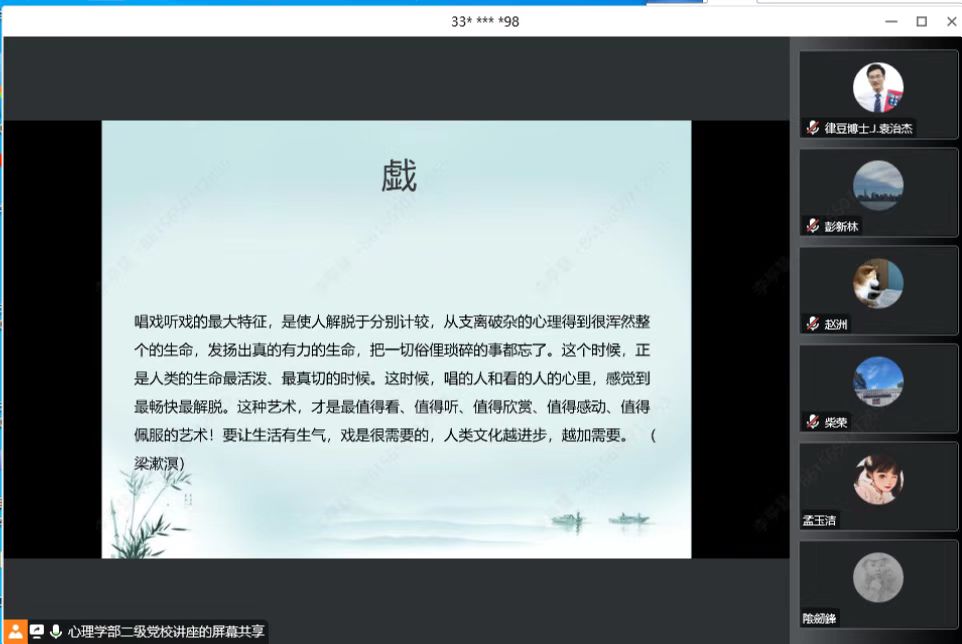 2023年5月10日下午,cn影院 党委和心理学部党联合举办二级党校讲座:《戏里的中华传统人文精神》。本次讲座由心理学部研究生第十三党支部承办,以线上线下结合的方式进行,主讲嘉宾为中国戏曲学院的刘小军教授,同时来自法学、心理、协同、环境、天文、核科学和数学学院的百余名同学师生党员和入党积极分子参加了本次讲座。