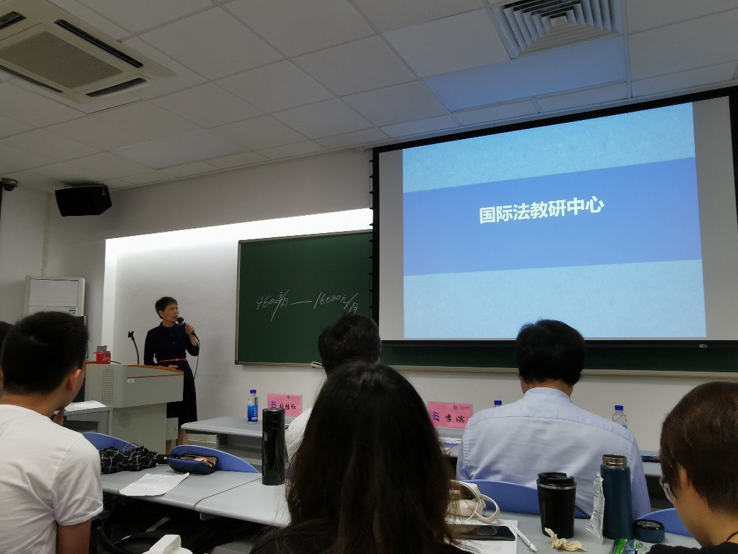 国际法学教研中心主任张桂红教授上台发言,她向同学们介绍了有关于国际法的课程和中心师资情况。张老师建议同学们应做好规划,摆脱迷茫,对于自己的课程与学分应当有自己的规划。