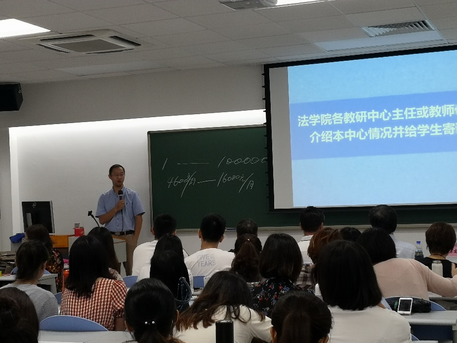 基础理论法学教研中心的马建银副教授上台发言,他向同学们介绍了有关于基础理论法学教研中心的课程设置与特色,本中心的师资情况,并进一步翔实地介绍了法律硕士培养方案中的主要内容、需注意的事项等。