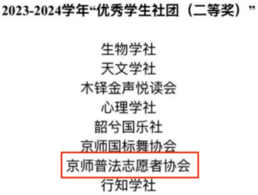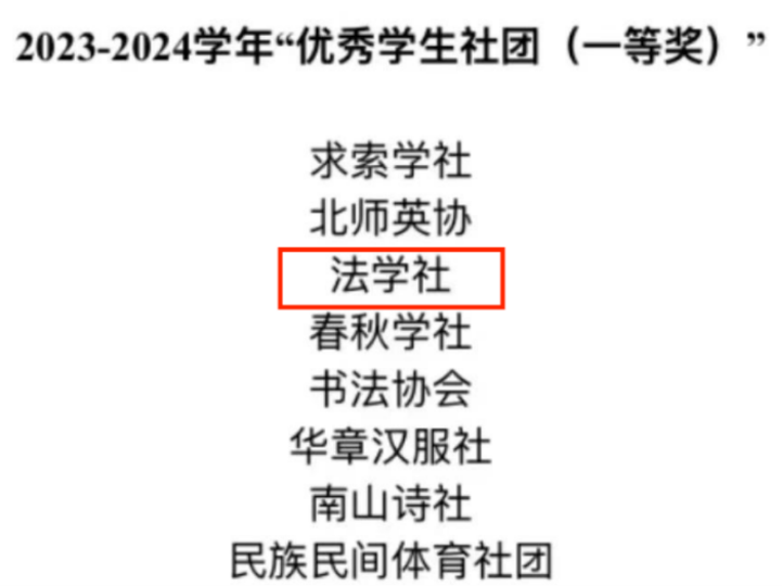 Adhering to the "Beijing Normal University Student Club Construction and Management Regulations," as well as the "Beijing Normal University Student Club Annual Review and Evaluation, and 'Outstanding Student Club' Selection Procedures," the process was governed by the principles of fairness, justice, and transparency. Following a rigorous review of documentation and on-site presentations, two clubs from the Law School, the Beijing Normal University Law Society and the Beijing Normal University Legal Education Volunteer Association, stood out among over 200 clubs. They were respectively awarded the titles of "Outstanding Student Club (First Prize)" and "Outstanding Student Club (Second Prize)" for the 2023-2024 academic year. Additionally, Su Wan'er, the president of the Law Society, was honored with the title of "Top Ten Presidents" for the same period. Notably, the Beijing Normal University Law Society has achieved the "Double Top Ten" recognition for 22 consecutive years.