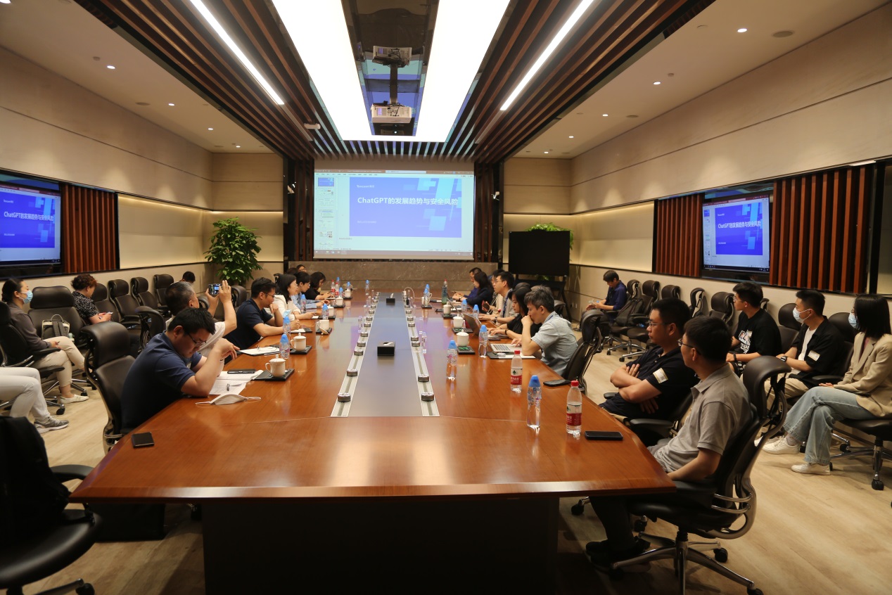 随后,双方围绕“未成年人保护”与“ChatGPT的发展”举行了交流会,腾讯安全法律部副总监任禹臣,腾讯安全法律部高级专家陈磊,腾讯安全法律部高级研究员张娜、周杨、李俊杰与会交流。张娜围绕未成年人保护问题,详细介绍了腾讯公司对未成年人网络游戏行为开展的特殊保护,通过限制未成年人游戏时长、充值消费,规范游戏平台等对未成年人进行全方位保护;在聊天软件设置青少年模式,使未成年人免受陌生人侵害;筑牢信息安全防火墙,在为未成年人推送感兴趣、有价值的信息的同时,避免他们受到不良信息的侵害。随后,陈磊分享了人工智能技术的发展历史、技术原理,并分析了ChatGPT技术未来的走向和趋势。此外,陈磊指出,犯罪分子利用新技术犯罪,并不需要技术达到成熟,只要达到一定的成功率就会有人铤而走险,并介绍了利用ChatGPT进行网络诈骗的最新案例,提醒ChatGPT技术发展带来的安全风险,从而强调人工智能规范使用的重要性。