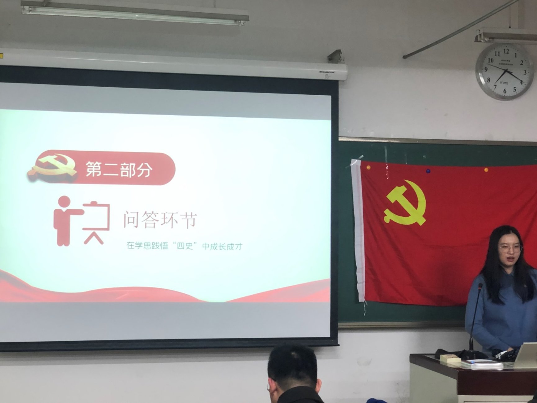 第三部分是趣味环节,为了提高党支部同志学习的积极性,增添此次活动的趣味性,党支部特地设置了问答环节。在这一环节中,支部书记林思丽同志通过展示题目,抽取人回答问题或者支部成员抢答问题来进行。支部成员踊跃参加,积极抢答,气氛非常热烈,使大家对“四史”知识有了更深刻的认识。