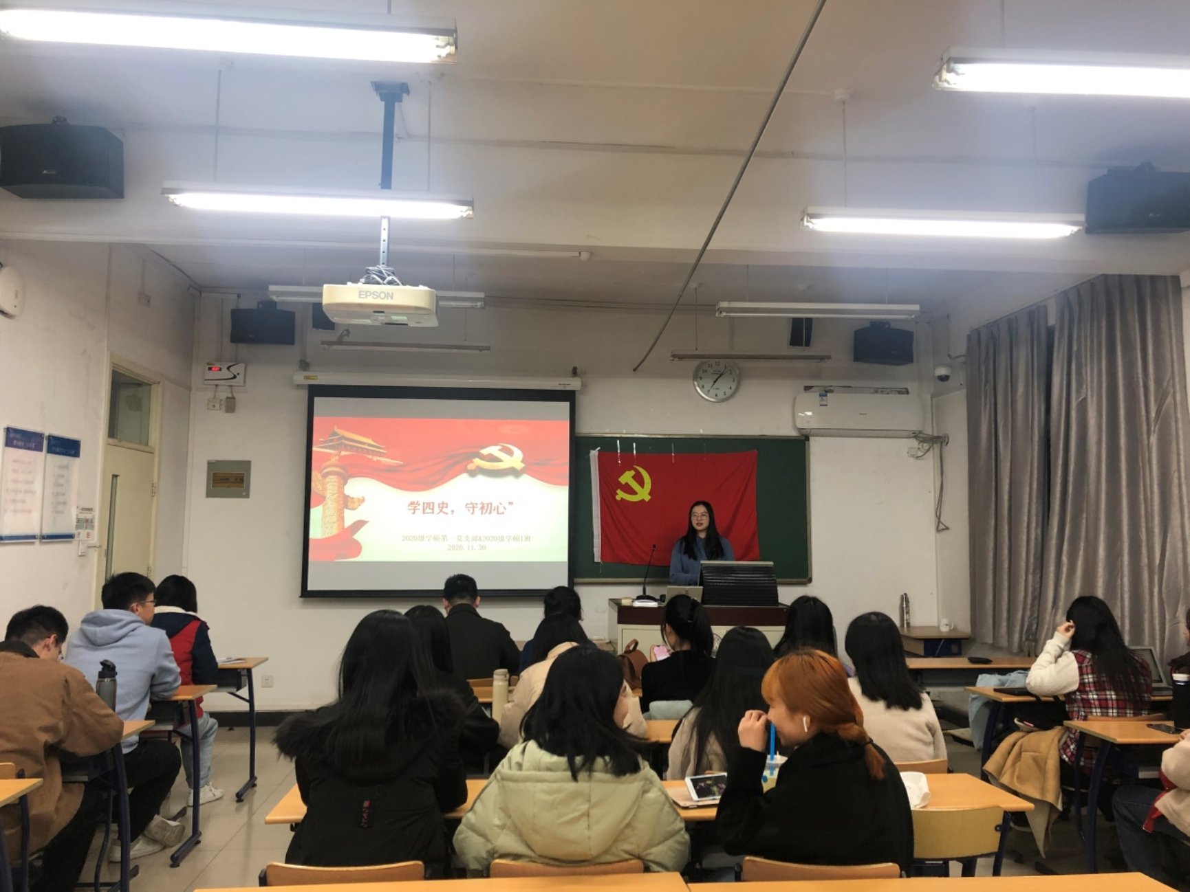 为贯彻落实学校党委关于深入开展党史、新中国史、改革开放史、社会主义发展史学习教育要求,弘扬爱国主义精神,2020年11月30日cn影院 2020级学硕第一党支部与2020级学硕一班联合举办“学四史、守初心”活动。本次会议共23人参加,其中正式党员应到16人,实到16人,入党积极分子和班级同学参加了此次活动,活动于教四117开展,由党支部书记林思丽进行主持。