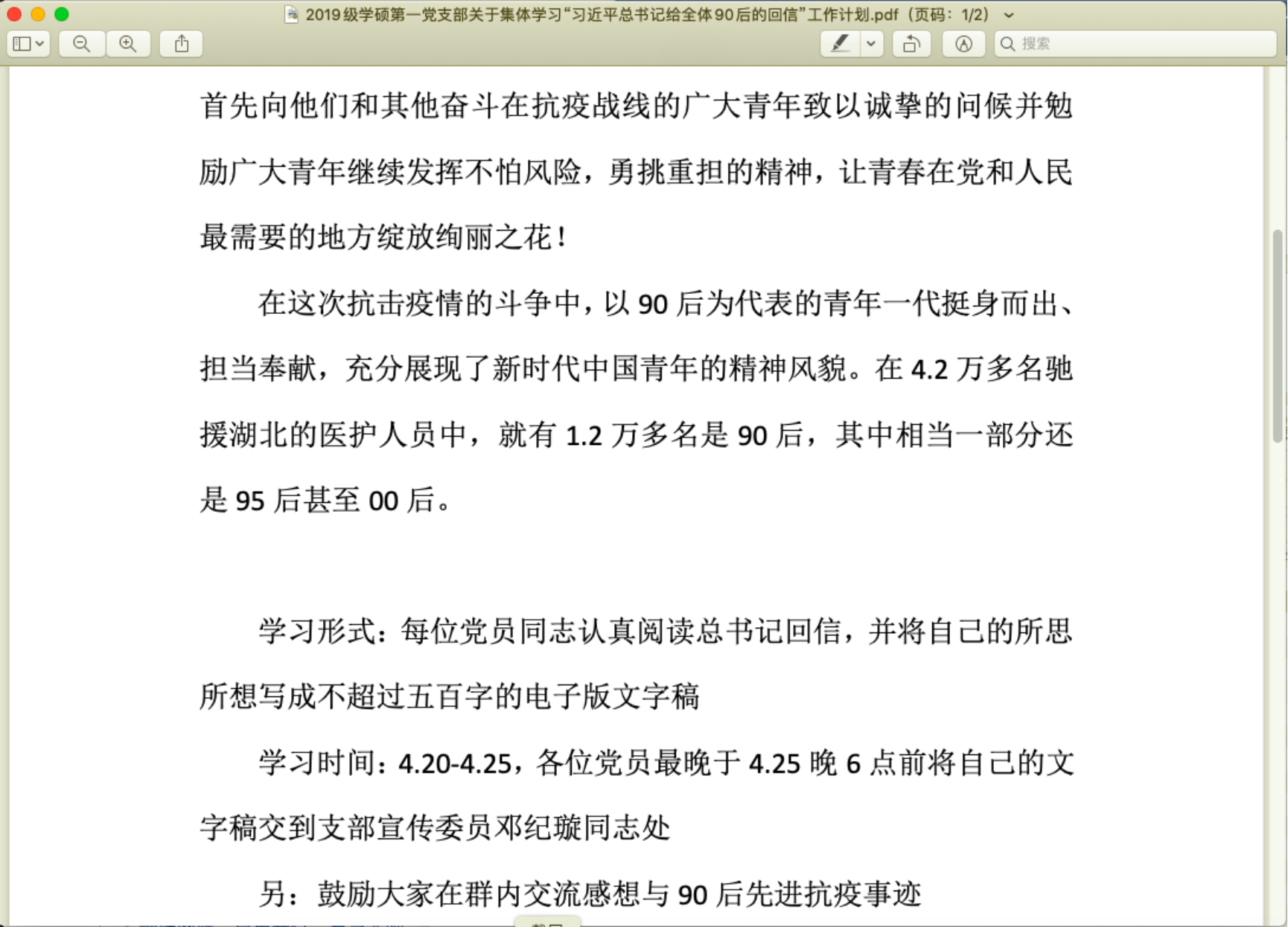 为深入学习和全面贯彻落实习近平总书记此番回信的丰富内涵和精神实质,鼓舞和勉励支部成员磨炼过硬本领,砥砺坚强意志品质,cn影院 2019级学硕第一党支部于本周召开线上小组会议,开展集体学习习近平总书记给北京大学援鄂医疗队全体 “90后”党员回信主题活动。本次活动由全体支部成员参加。