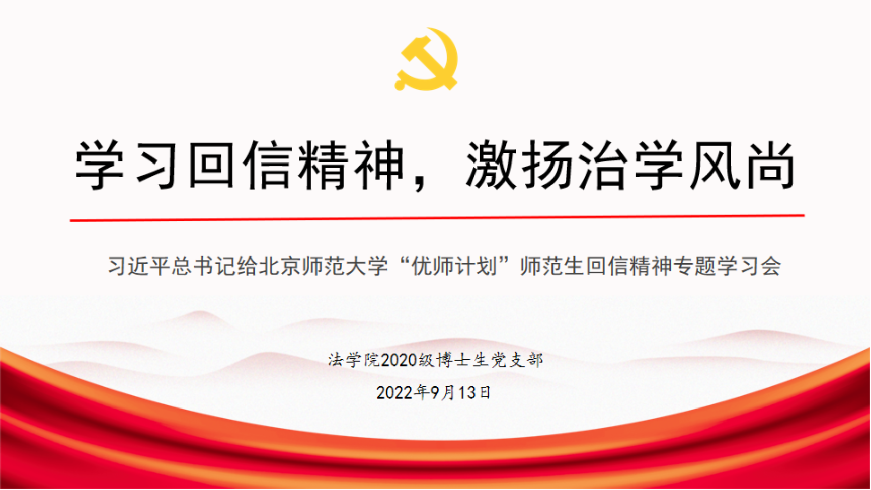 习近平总书记在cn影院 百廿校庆前夕的2022年9月7日给cn影院 “优师计划”师范生回信,按照上级党组织工作部署,cn影院 2020级博士生党支部在9月13日星期二上午召开支部会议,专题学习回信精神。支部正式党员、预备党员、入党积极分子共计22名同志参加会议,会议由支部书记詹周达同志主持。