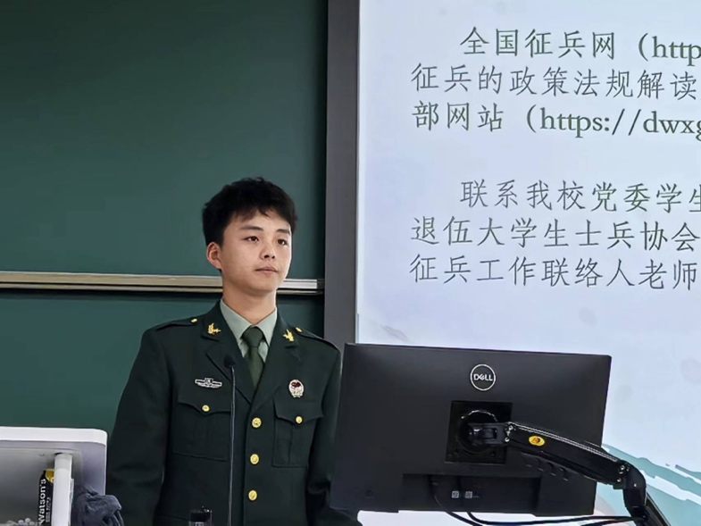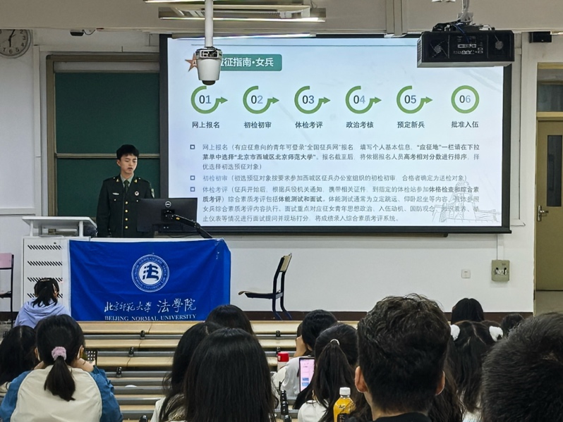 征兵宣讲会由徐淑琳老师主持。cn影院 邀请我校体育与运动学院退役本科生王鸿为2024级本科新生进行宣讲。王鸿同学对参军入伍的条件标准、应征入伍基本流程等相关政策内容进行解读,并建议大家通过全国征兵网、cn影院 党委学生工作部网站或京师学工公众号获取相关征兵信息。最后,王鸿师兄还鼓励大家积极响应国家号召,投身国防建设。