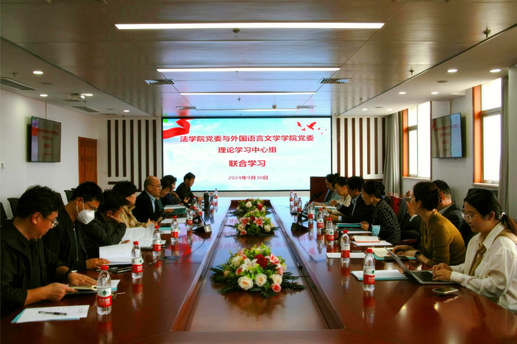 9月30日,cn影院 党委、外国语言文学学院党委,在后主楼1822高铭暄学术报告厅开展理论学习中心组联合学习。外国语言文学学院党委书记艾忻、院长苗兴伟、副院长王楠、王德亮、孙晓慧、党委副书记郑淼文;cn影院 党委书记柴荣、院长梁迎修、副院长阴建峰、何挺、贺丹、党委副书记蔡纹、宣传委员刘航出席会议,cn影院 纪检委员彭新林、副院长袁治杰、工会主席严厚福、外国语言文学学院组织员李亚南列席会议。会议由cn影院 院长梁迎修主持。