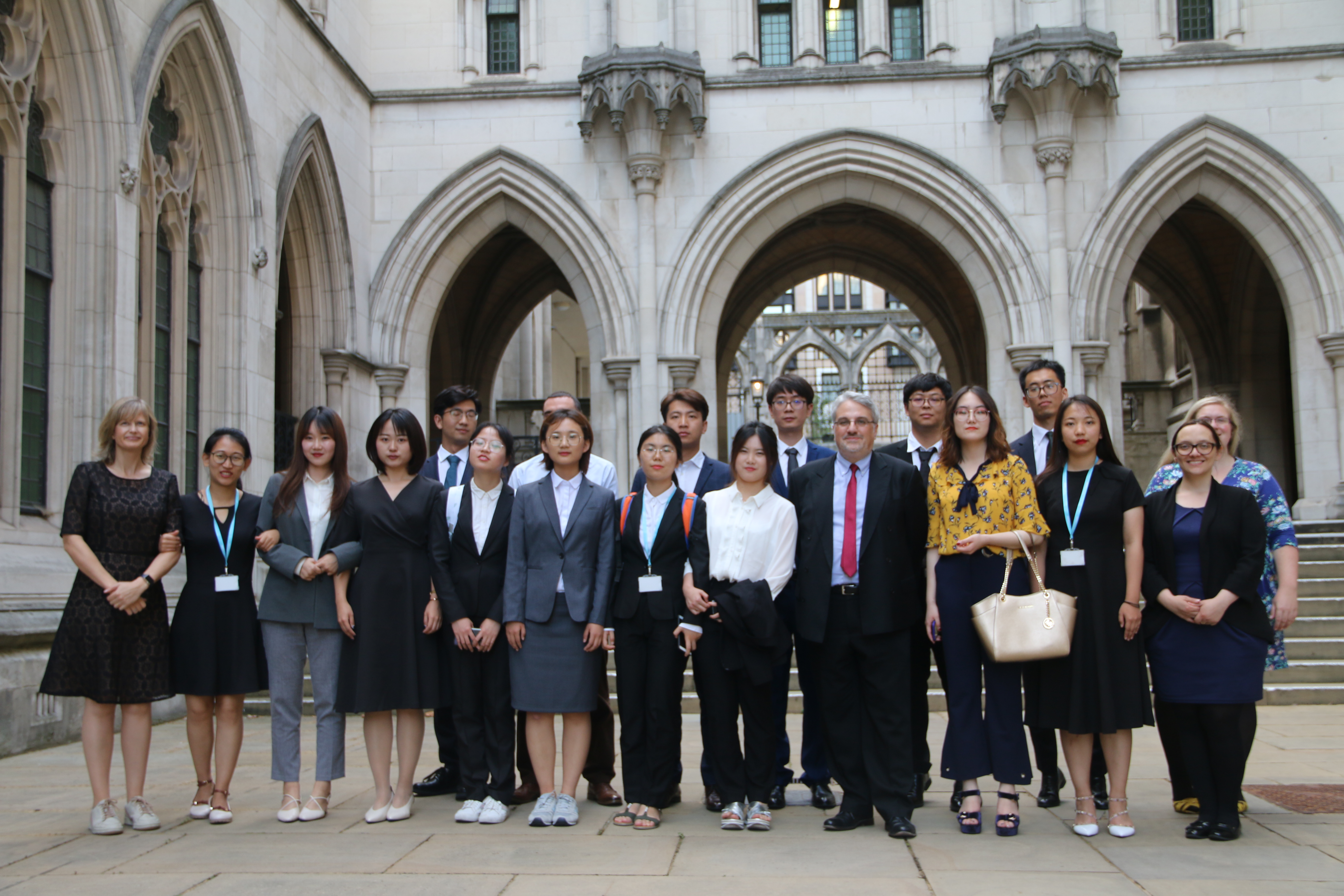 (同学们在英国皇家法院进行模拟法庭比赛后与英方老师合影)