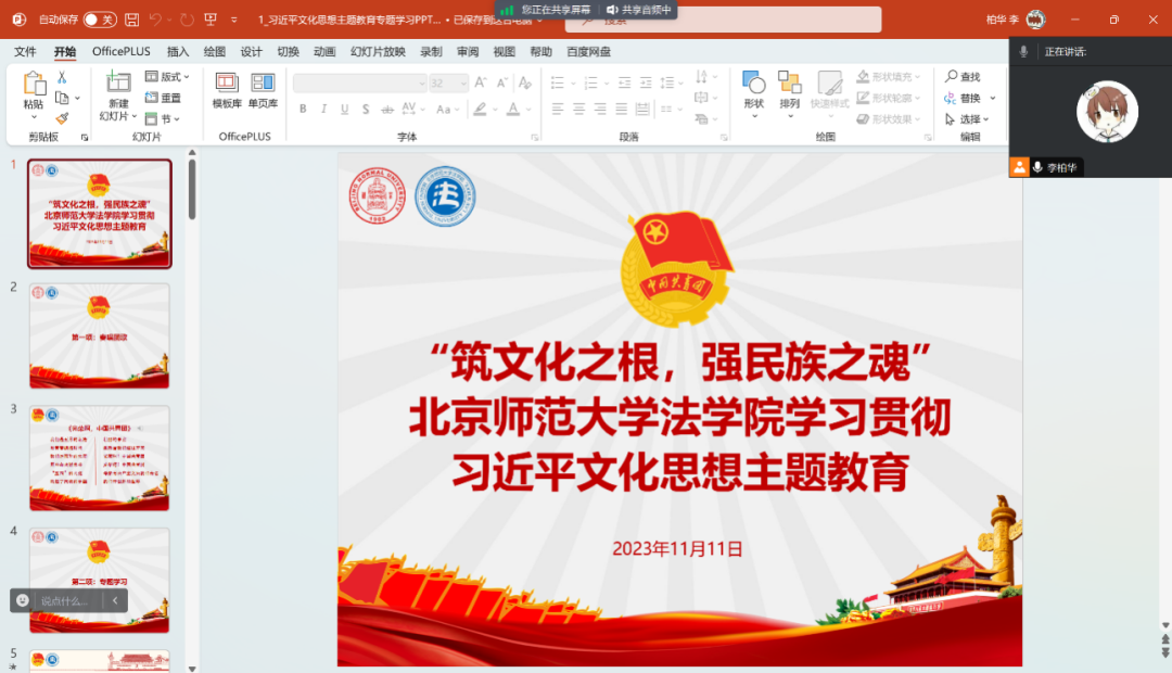 为加强cn影院 初级团校成员对习近平新时代中国特色社会主义思想的认识和了解,读懂习近平总书记深沉的文化情怀,cn影院 初级团校于2023年11月11日晚19时开展了“筑文化之根,强民族之魂”线上主题团课。本次主题团课由理论研究部干事李柏华主持。