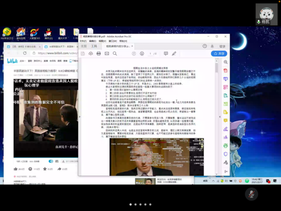 各位同学大家好,虽然已经大年初六了,首先还是要再祝大家新春快乐!我们放假已经超过一个月,而且虽然之后要上网课,我们还要再有将近一个月的时间才能回到学校,今天在这个分享会,我想和大家分享下我假期的一些所想和所做。罗曼罗兰说过,世上只有一种英雄主义,就是看清生活的本质却仍然热爱着它。无论是我们在学校还是在家,让我们以积极的态度去生活,去面对。也想运动的各位我们也可以一起约运动约学习。