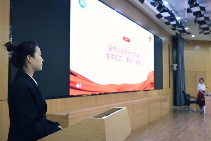 会议第一项,主持人报告会议人数,宣布大会开幕,全体起立,奏唱《中华人民共和国国歌》。