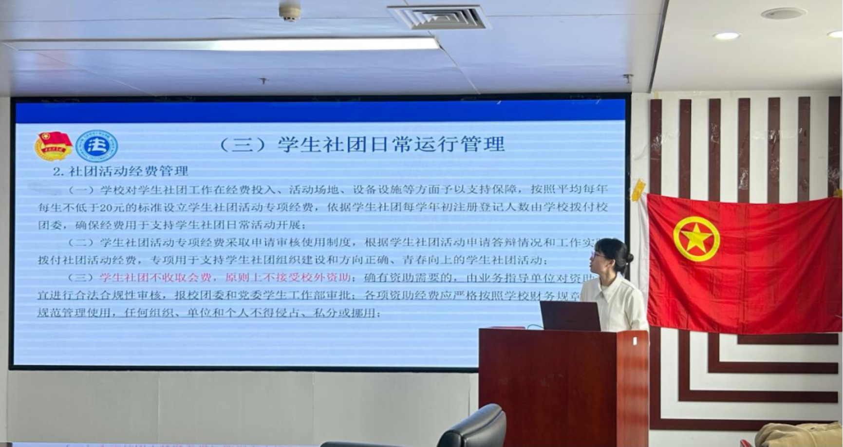 首先,进行会议第一项议程:由社团实践部委员张政组织学习社团管理规定。重点强调学生社团活动及场地审批流程、学生社团活动督察、学生社团日常运行管理、学生社团活动管理等事宜。