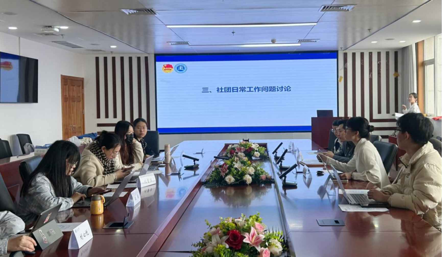 之后,进行会议第三项议程:与会人员就社团工作进行圆桌讨论。其中,王皓月老师强调各社团在开展活动中要强化意识,严格规范言行与社团活动审核。梅笑宇鼓励各社团加强外联,积极拓宽活动开展渠道。张政则对社团日常活动形式与管理提出建议,提醒做好工作记录与换届工作。