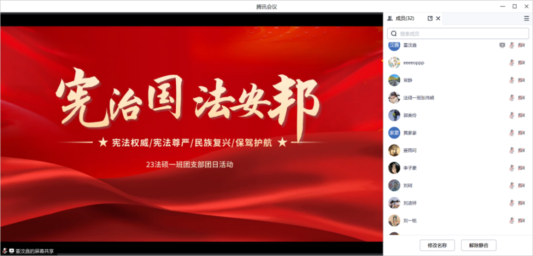 为增强同学们的宪法意识,弘扬宪法精神,加强宪法实施,全面推进依法治国、依宪治国,cn影院 2022级学硕2班全员参加了cn影院 学生会组织的线上“宪影之行,法律之思”观影活动,集体观看电影——《第一大案》。观影活动于4日晚7点开始,学硕二班团支部全体成员准时进入腾讯会议室线上观影。本次观看的电影《第一大案》是以新中国反腐第一大案——刘青山、张子善案侦办始末为蓝本,讲述1951年陈怀邦在反特行动中,挖出了地委书记刘青山的惊天秘密,昔日战斗英雄成为巨贪,陈怀邦并没有因旧时情谊而放弃内心所追求的正义,而是选择了忠诚于党纪国法,忠诚于人民,终将其送上了人民审判台故事的影片。