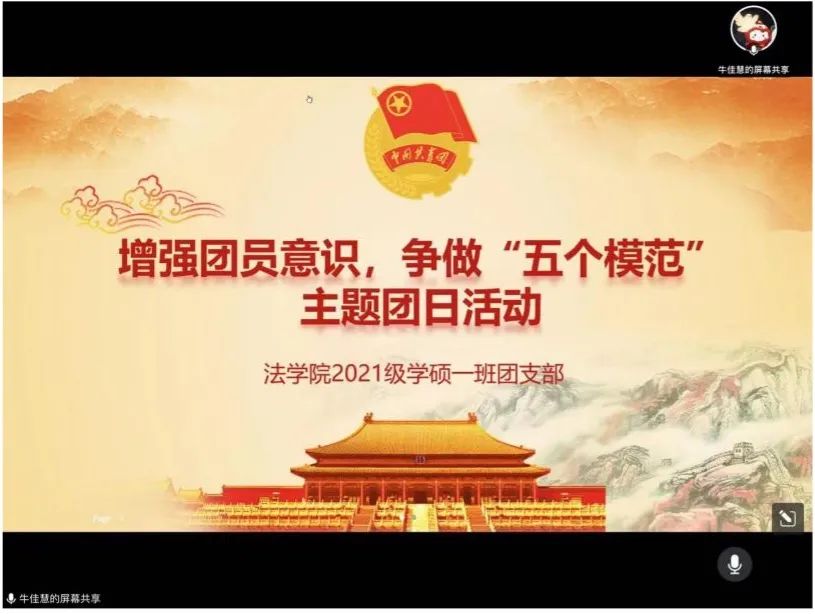 5月13日晚,cn影院 2021级学硕一班线上召开了以“增强团员意识,争做‘五个模范’”为主题的团日活动。本次活动由团支书牛佳慧同学主持。活动由五项内容组成,分别是政治生日会、理论学习会、线上观展、主题团课以及实践活动分享。全体参会团员一齐合唱团歌,重温入团誓词,参会同学交流分享了各自的入团初心及入团以来的心得感受。全体同学共同对团章进行了回顾,并学习了习近平总书记在庆祝中国共产主义青年团成立100周年大会上的讲话。随后,同学们一同进入了线上展厅,参观了cn影院 青年运动主题展,一同感受了变革图强、育人兴邦梦想的一代代北师大先进青年留下的青春业绩。在第四个环节——以回顾党的青年运动史为主题的团课上,参会同学们分享了自己观展的心得感受。