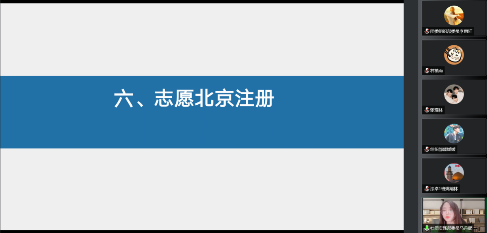 首先,组织委员盛媛媛为新生团务负责人详细具体地讲解了关于北京共青团线上系统的使用方法以及团组织关系转接的相关内容。她强调:根据《团章》规定,及时办理团关系转接是每个团员的基本义务,如果不及时转接团组织关系,可能无法认定团员身份,被认定为自行脱团、影响未来入党及评优评先。新生团组织关系转入工作分为线下和线上两部分。两部分均完成后,即标志团组织关系转接成功。同时,她也针对大家在共青团线上系统使用过程中可能会遇到的常见问题作出了详细解答。