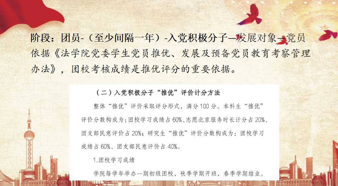随后,主持人根据《cn影院 党委学生党员推优、发展及预备党员教育考察管理办法》为大家解读了推优评分构成、cn影院 初级团校模块设置以及团校考核方法,并在考核方法部分介绍了团校的考勤与请假方式,强调团校培养对于成员参与程度的要求,鼓励同学们多多参与、认真学习,在初级团校中收获时政知识、理论素养与友爱情谊。