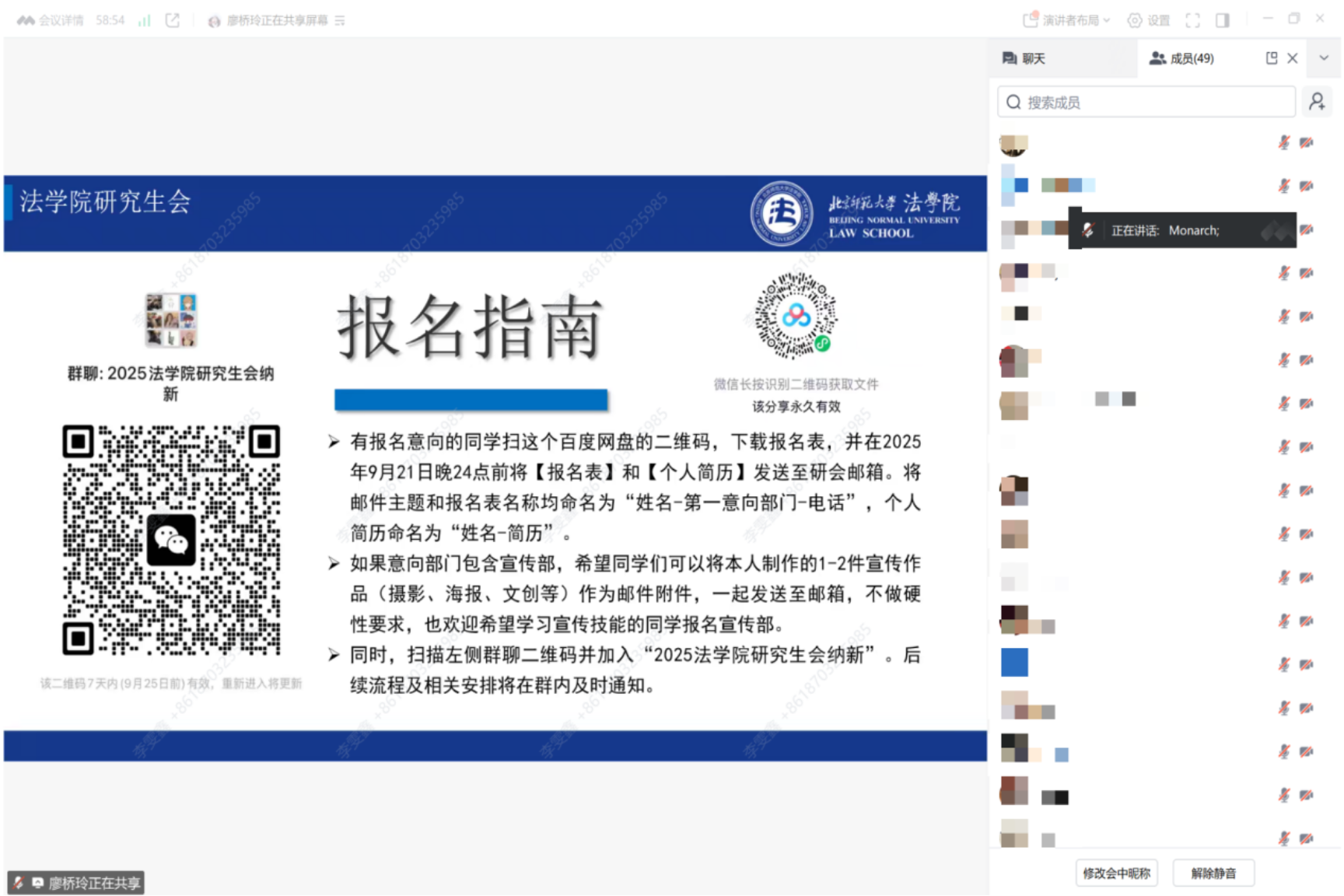 cn影院 团学研组织招新宣讲会于9月19日晚在线上圆满举行。cn影院 团委副书记、各部门委员,研究生会主席团成员,学生会主席团成员及cn影院 本硕博新生等共计七十余人参加本次宣讲。宣讲会由团委组织部委员李鹤洁主持。宣讲会上,各部门负责人依次亮相,为同学们详细介绍工作内容与招新计划,展现出团学研组织的活力与包容。