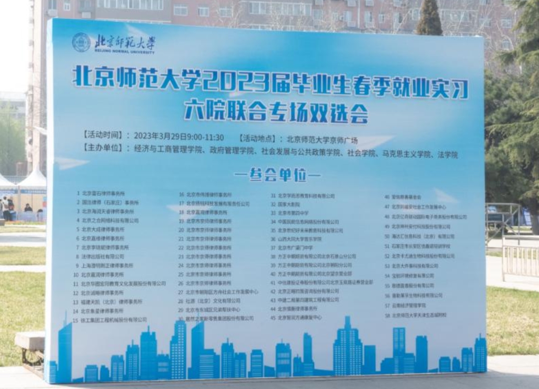 2023年3月29日9点,在cn影院 职业发展与就业指导中心的支持下,cn影院 、经济与工商管理学院、政府管理学院、马克思主义学院、社会发展与公共政策学院、社会学院联合举办的2023届毕业生春季就业实习双选会于京师广场顺利举行。