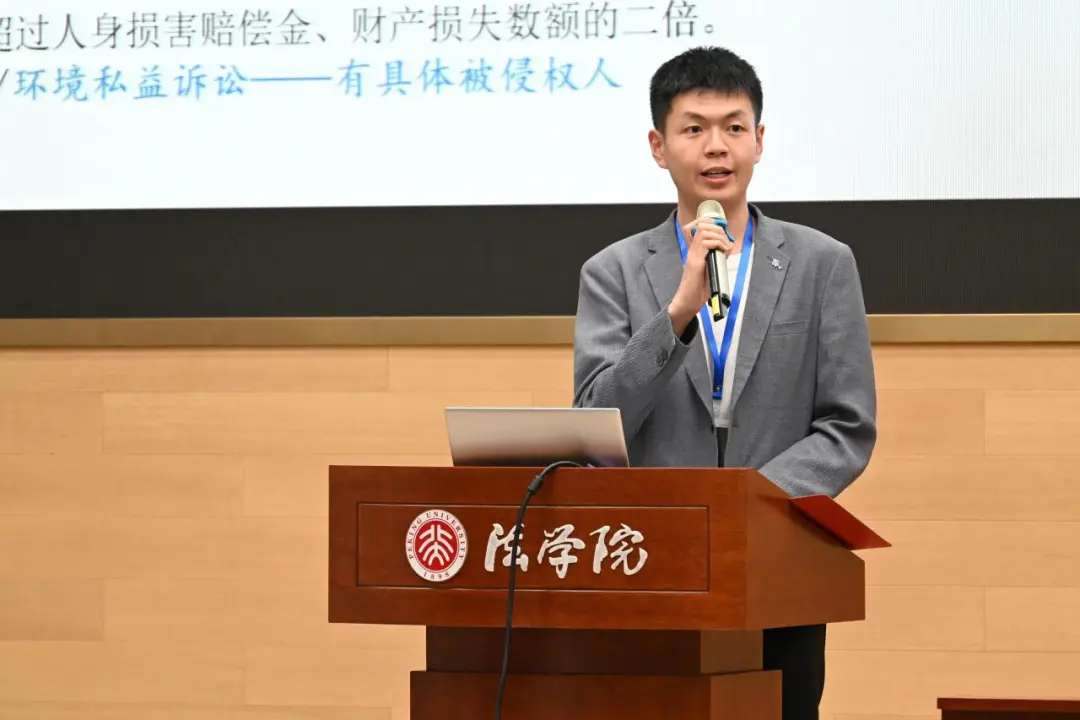 随后各校与会代表轮流发言,cn影院 23级本科生杨子毅代表cn影院 围绕“环境侵权惩罚性赔偿”进行议题展示,并广受好评。