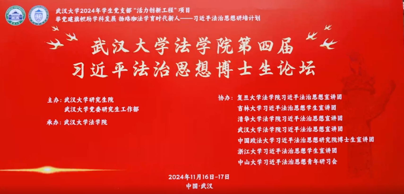 11月16日至17日,武汉大学cn影院 第四届习近平法治思想博士生论坛在cn影院 模拟法庭成功举办。本论坛由武汉大学研究生院、武汉大学党委研究生工作部主办,武汉大学cn影院 承办,复旦大学cn影院 习近平法治思想宣讲团、吉林大学习近平法治思想学生宣讲团、清华大学cn影院 习近平法治思想宣讲团、武汉大学cn影院 习近平法治思想宣讲团、中国政法大学习近平法治思想研究院博士生宣讲团、浙江大学习近平法治思想学生宣讲团、中山大学习近平法治思想青年研习会参与协办。