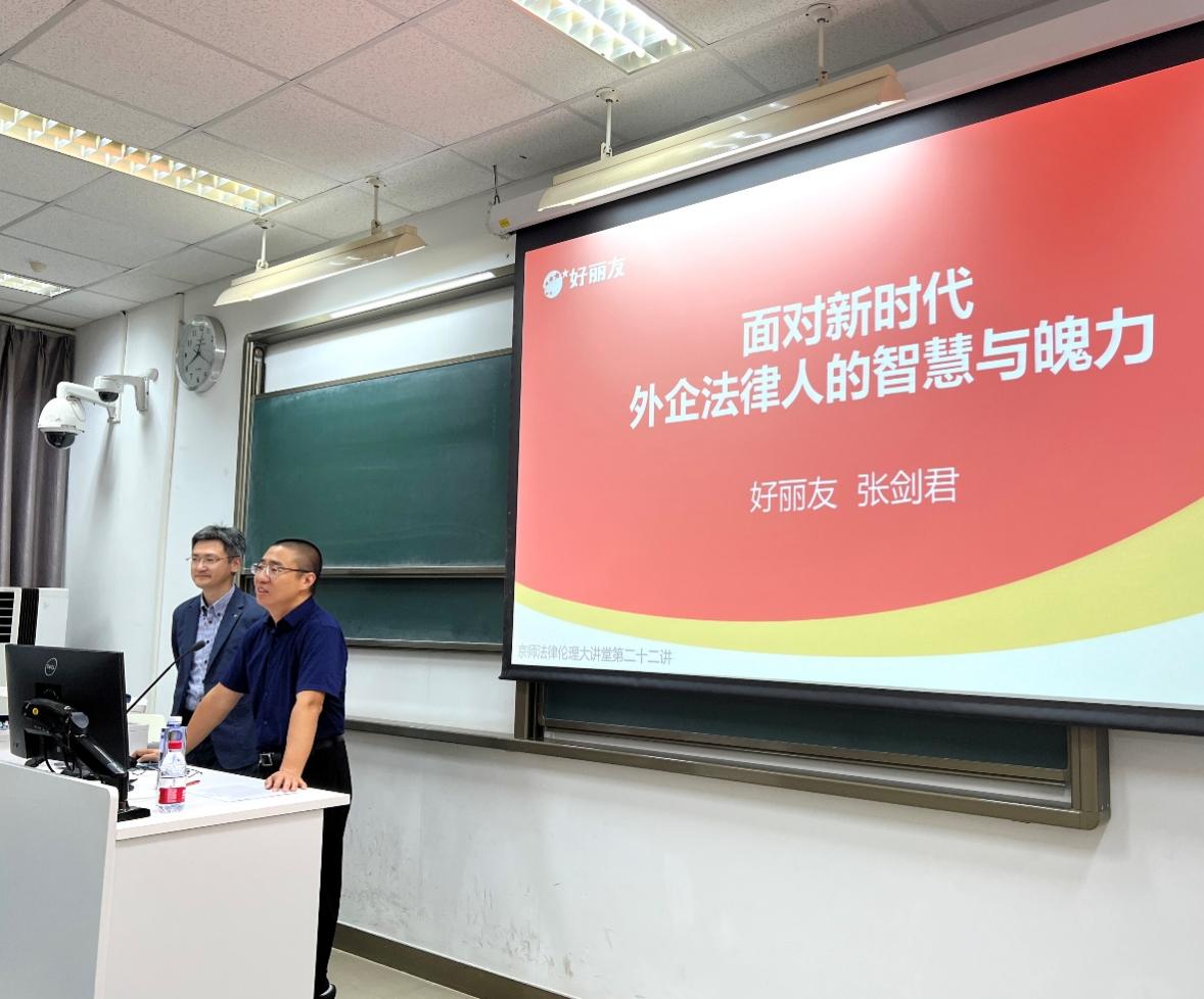 9月23日,京师法律伦理大讲堂第二十二讲“面对新时代,外企法律人的智慧与魄力”在cn影院 北京校区电子楼106教室顺利举办。本次讲座由好丽友食品有限公司法务总监暨总法律顾问、厦门仲裁委员会仲裁员、敦煌国际仲裁院仲裁员、北京中周法律应用研究院理事、陕西省法学会市场监管法治研究会常务理事、北京-长三角知识产权保护实务智库首批专家张剑君先生主讲,cn影院 暨刑事法律科学研究院廖明副教授主持,逾200名学生参加了本次讲座。