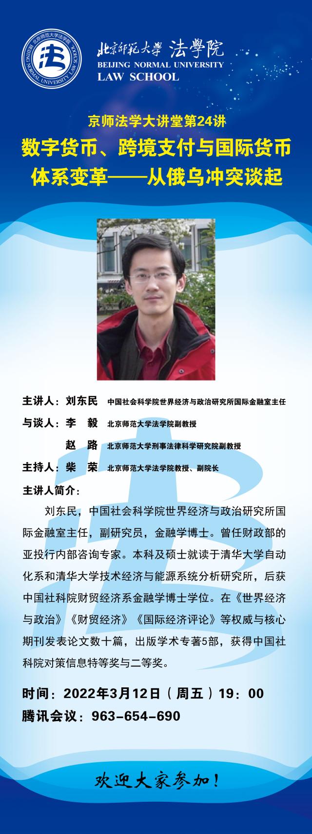 【03.12】京师法学大讲堂第24讲:数字货币、跨境支付与国际货币体系变革——从俄乌冲突谈起/主讲人:刘东民