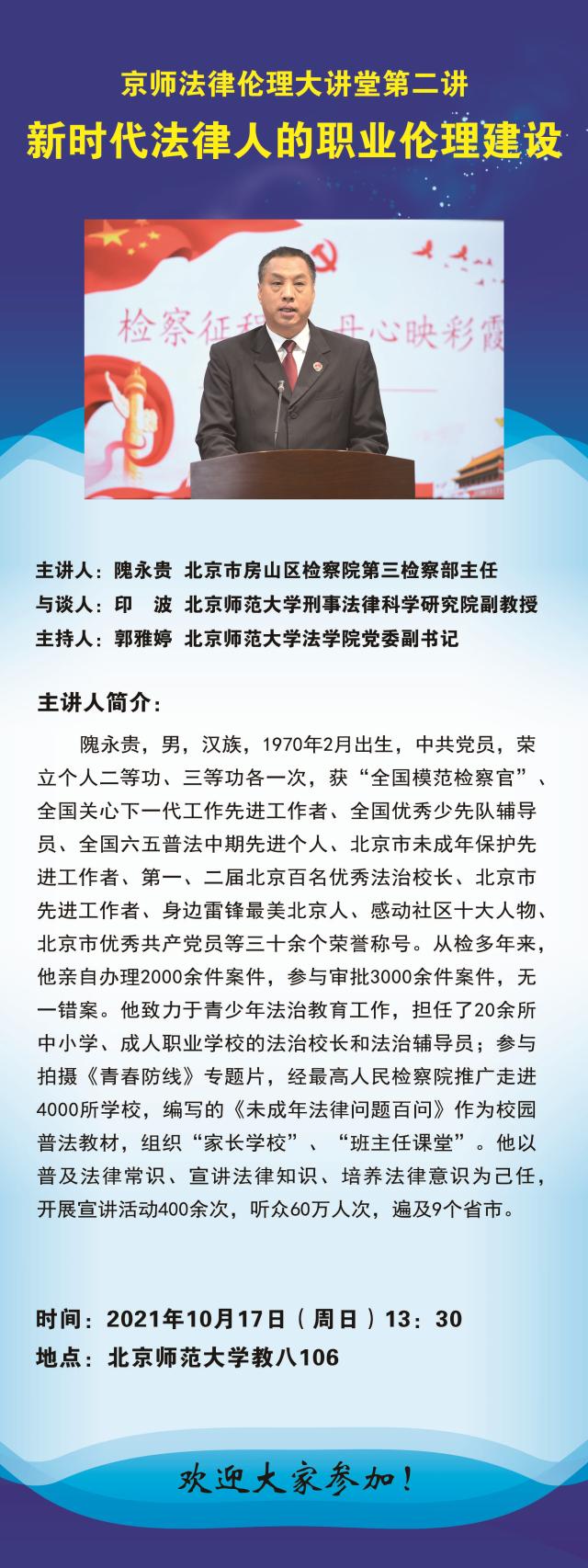 【10.17】京师法律伦理大讲堂第二讲——新时代法律人的职业伦理建设/主讲人:隗永贵