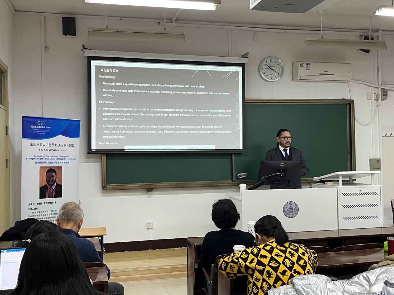 2023年11月23日上午,“京师反腐败大讲堂系列讲座”第40期在cn影院 成功举办。本次讲座由cn影院 王秀梅教授主持,巴西马拉尼昂州有组织犯罪检察官卡修斯·吉马拉埃斯·柴主讲,讲座的主题是“打击跨国腐败:加强金砖国家反腐败框架”。cn影院 王秀梅教授、林洁莹博士后、张雪博士后、王肃仪博士等50余名师生参加了本次讲座。