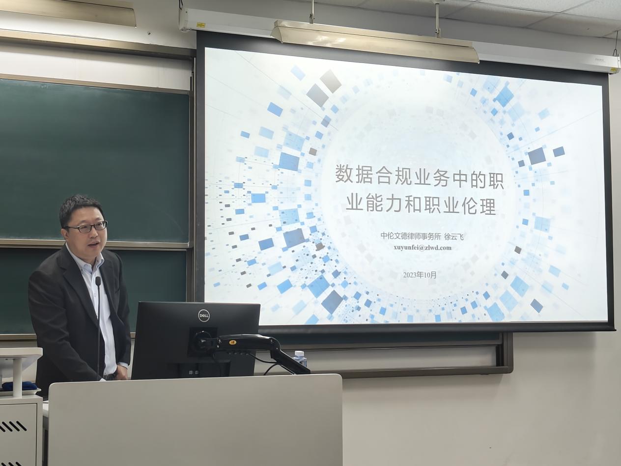 讲座伊始,徐云飞律师以徐玉玉被电信诈骗案、斯诺登事件为引言,说明了个人信息和数据保护的重要性。接着,他先后从数据合规业务概述、数据合规业务中的职业能力与职业伦理两个板块展开分享,使在场同学对数据合规领域有了全面深入的了解和进一步的思考。