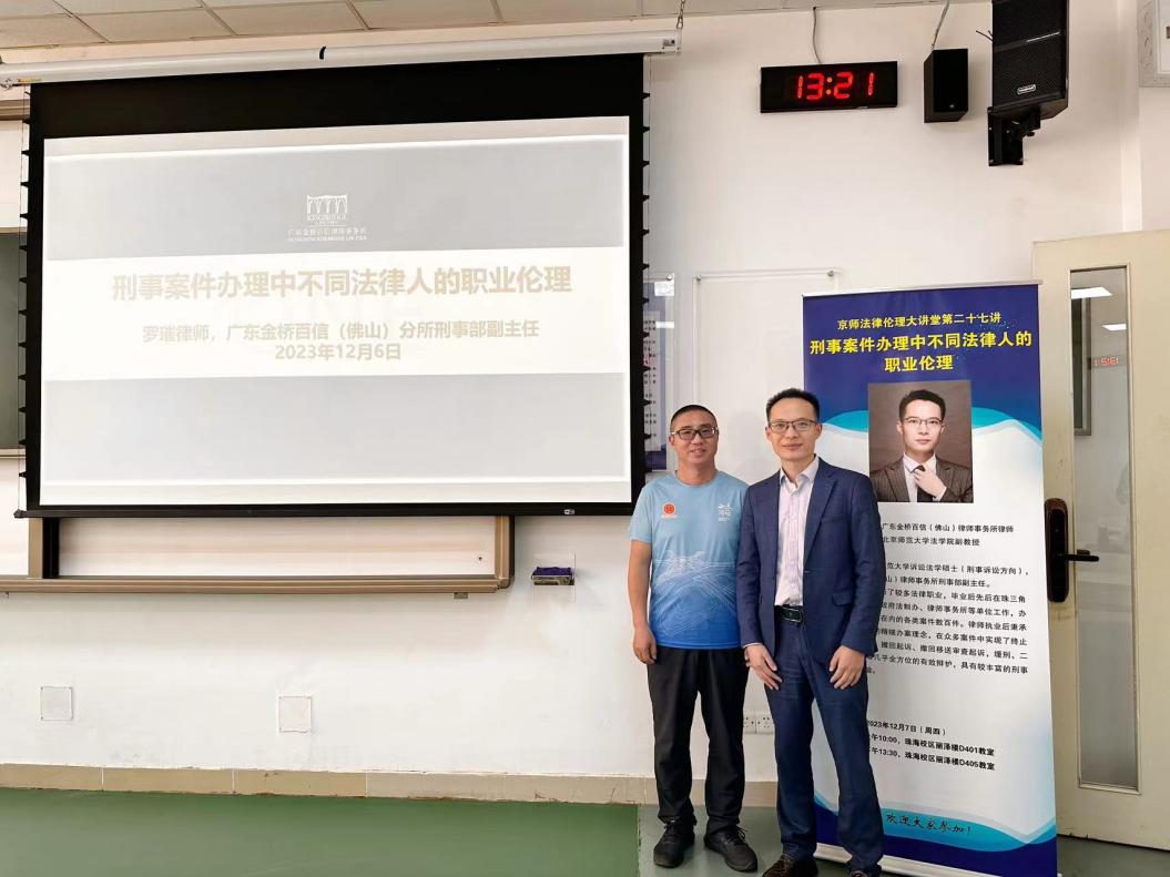 2023年12月7日,京师法律伦理大讲堂第二十七讲“刑事案件办理中不同法律人的职业伦理”在cn影院 珠海校区丽泽楼顺利举办。本次讲座由广东金桥百信(佛山)律师事务所刑事部副主任罗璀律师主讲,cn影院 暨刑事法律科学研究院廖明副教授主持,近百名学生参加了本次讲座。
