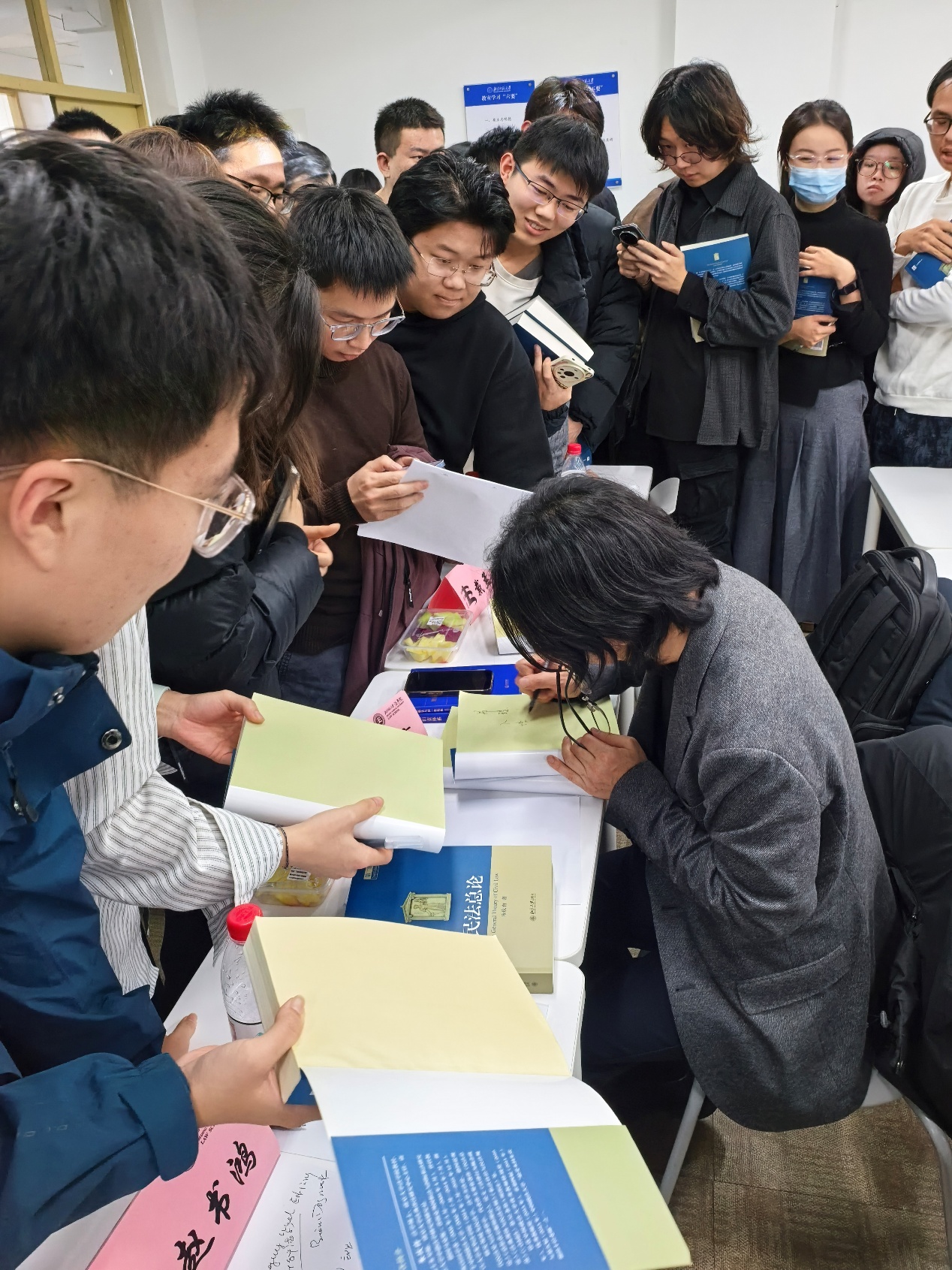 在互动环节,朱庆育教授与现场同学深入探讨了法律解释的立场、法学共识的确立等法学方法论中的核心问题,并将签名版《民法总论(第二版)》赠予提问同学,同时为众多现场同学亲笔签名。讲座现场气氛热烈。