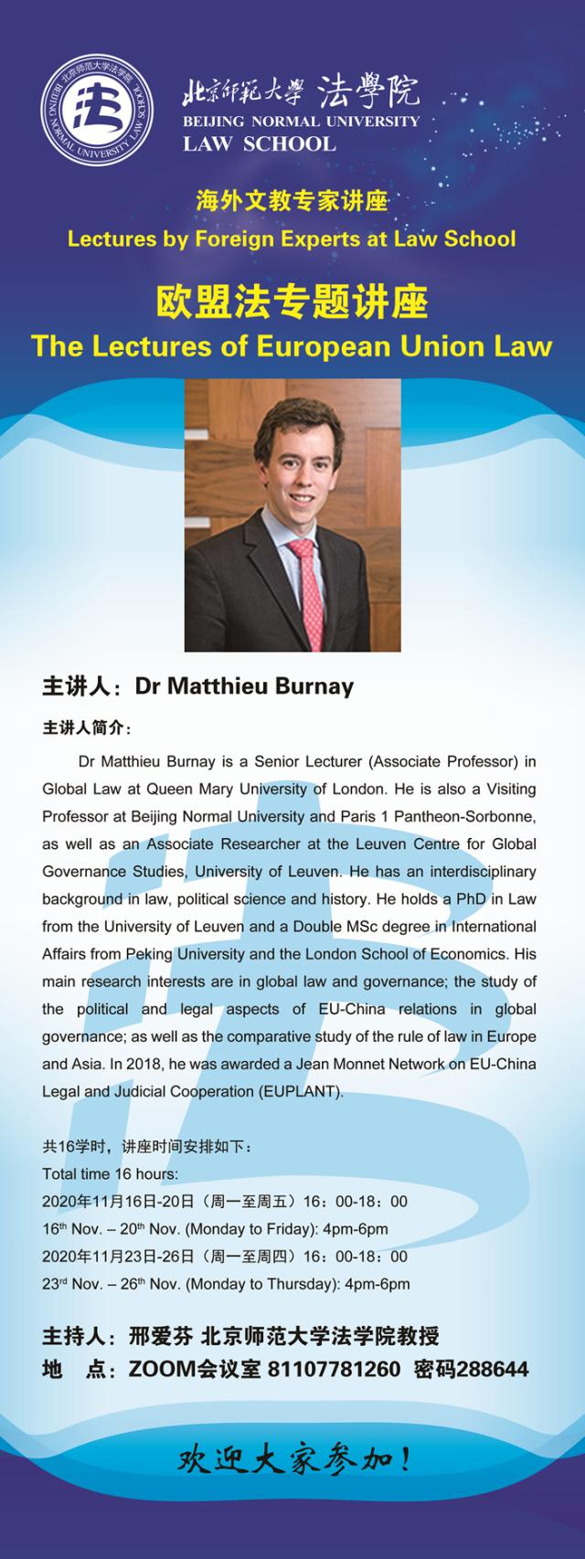 【11.16-11.26】海外文教专家讲座 Lectures by Foreign Experts at Law School & 欧盟法专题讲座 The Lectures of European Union Law/主讲人:Dr Matthieu Burnay