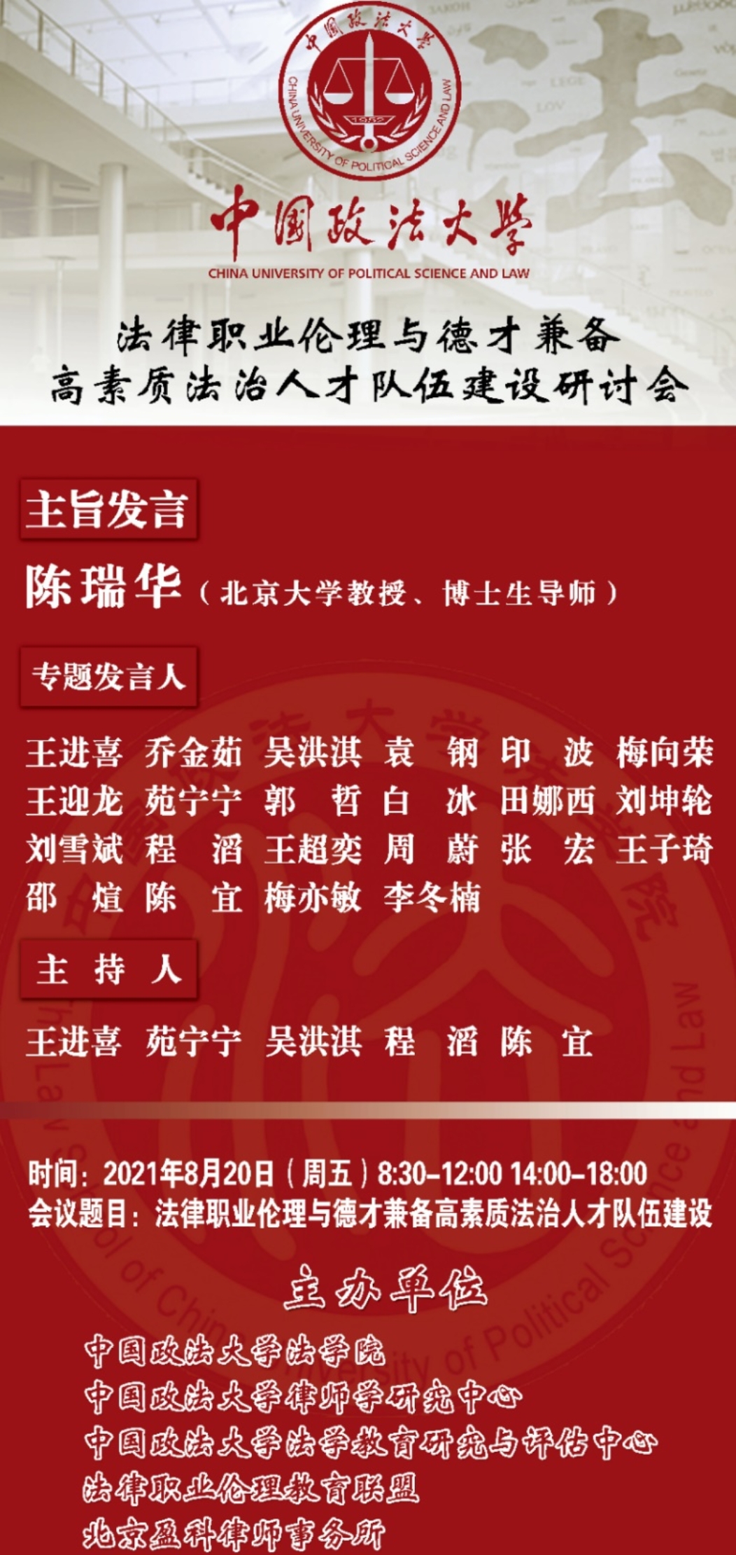 2021年8月20日,cn影院 法学院印波副教授参加了“法律职业伦理与德才兼备高素质法治人才队伍建设”研讨会,本次研讨会由中国政法大学cn影院 、律师学研究中心、法学教育研究与评估中心、法律职业伦理教育联盟、北京市盈科律师事务所共同举办。来自北京大学、中国政法大学、cn影院 、湖南大学、吉林大学、北京工商大学、河南财经政法大学、北京盈科律师事务所等单位的专家共计190余人在线上参与了本次会议。