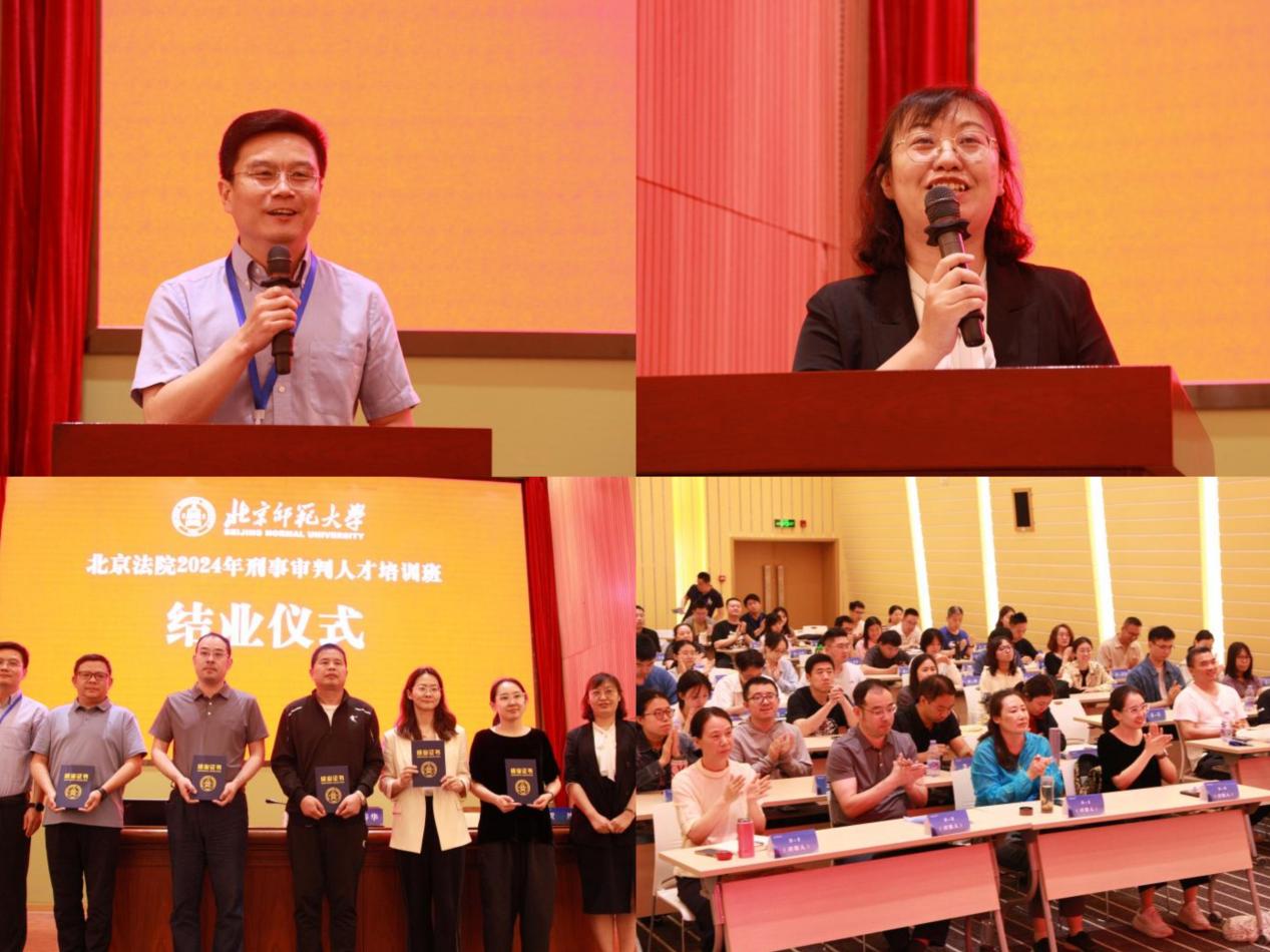 7日中午,为期五天的培训接近尾声。结业仪式由cn影院 培训中心主任施敏老师主持,北京市高级人民法院政治部教培处李春华副处长作了总结讲话,充分肯定了北师大cn影院 在本次培训中的精心筹备,为学员们带来了一场又一场的高水平学术盛宴。cn影院 副院长贺丹教授为学员们致结业词,祝贺学员们认真完成了培训任务并顺利结业。结业仪式的最后,李春华副处长、贺丹副院长共同为学员们发放了结业证书及合影照片,北京法院2024年刑事审判人才培训班圆满落幕!