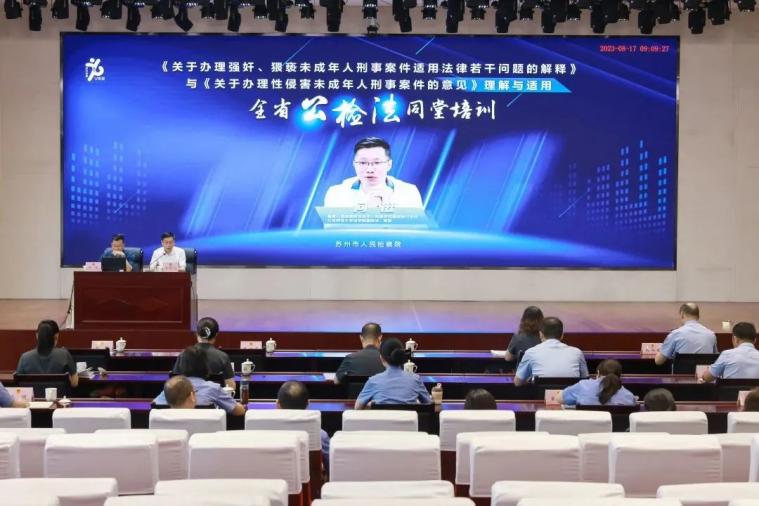 2023年8月17日,cn影院 副院长何挺教授应邀在苏州市人民检察院面向江苏全省进行了性侵害未成年人案件办理的同堂培训。本次培训由江苏省人民检察院第八检察部毛建忠主任主持,苏州市检察院、法院、公安干警在苏州市人民检察院参加培训,江苏省其他地区的涉未案件办案人员以电视电话会议方式集中参加培训。