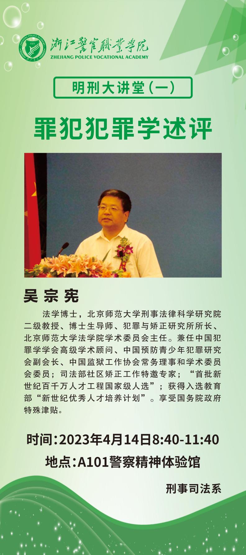 2023年4月14日上午,cn影院 暨刑事法律科学研究院二级教授、博士生导师、cn影院 学术委员会主任吴宗宪教授在浙江警官职业学院警察精神体验馆举办了题目为《罪犯犯罪学述评》讲座,这是该校新设立的明刑大讲堂的第一讲,讲座由浙江警官职业学院刑事司法系副主任张崇脉教授主持。