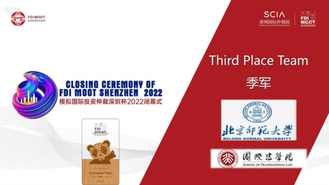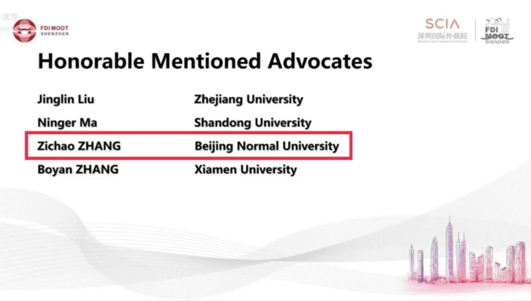 2022年8月14日,第十五届模拟国际投资仲裁竞赛(“Foreign Direct Investment International Arbitration Moot”,“FDI Moot”)暨第二届中国区选拔赛国际投资仲裁深圳杯(FDI MOOT SHENZHEN)比赛结果公布,cn影院 代表队获得全国季军,并且成功晋级国际赛(FDI Moot Global Rounds);西娅、张孜超同学获得优秀辩手 (Honorable Mentioned Advocate) 个人奖项。