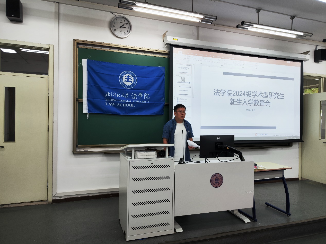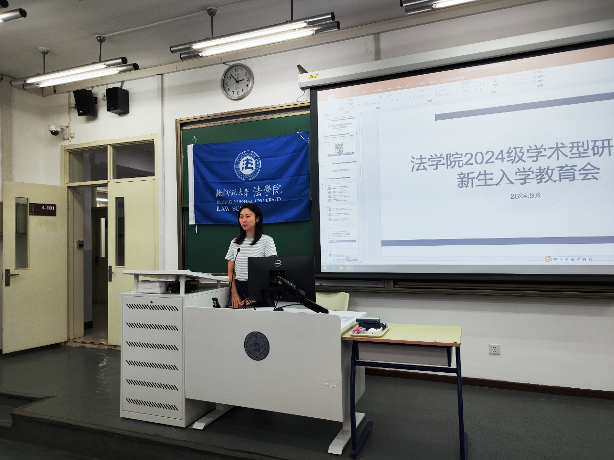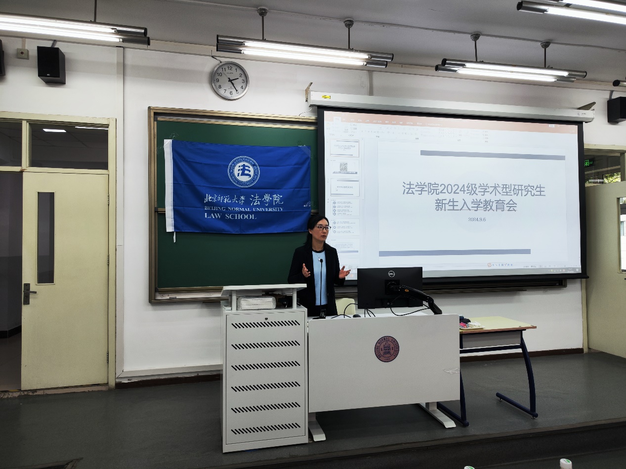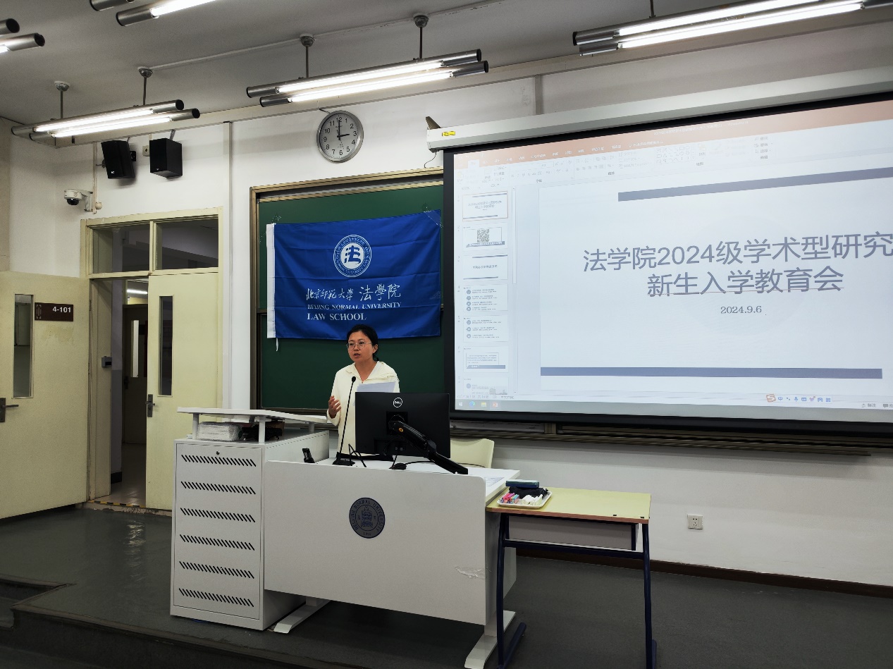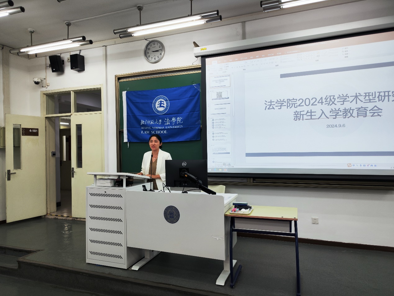 下午2点会议准时开始。贺丹代表cn影院 向全体2024级硕博新生表示热烈欢迎,并为同学们介绍了北师大法学学科的发展历程以及近年来学院在学科建设、师资团队、人才培养等方面的丰硕成果。她寄语全体新生要珍惜学院的丰富学术资源。