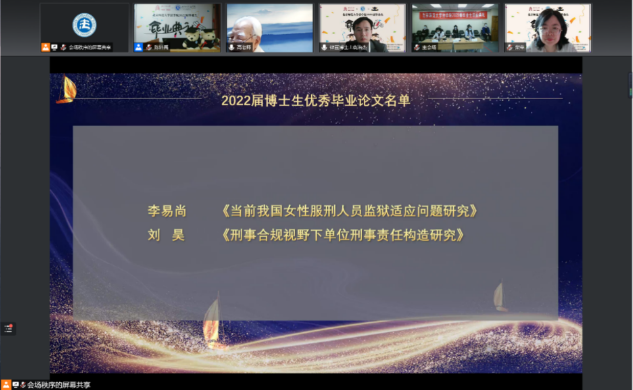 线上出席典礼的嘉宾有:cn影院 刑事法律科学研究院名誉院长高铭暄教授、cn影院 宋英辉教授、春晖刑辩奖学金捐赠人赵春雨律师、校友代表全国法院先进个人、北京市高级人民法院蔡秀法官、cn影院 院长梁迎修教授,cn影院 党委书记、副院长柴荣教授、cn影院 副院长阴建峰教授、cn影院 副院长、2019级法硕3班班主任李滨教授、cn影院 副院长袁治杰教授、刑事法律科学研究院副院长何挺教授、cn影院 工会主席严厚福副教授、cn影院 劳佳琦副教授、cn影院 2019级博士1班班主任汪庆华教授、cn影院 2019级博士2班班主任贾济东教授、cn影院 2019级学硕2班班主任商浩文副教授、cn影院 2018级本科瀚德实验班班主任贾婉婷老师、cn影院 2018级本科卓越实验班班主任马丽亚老师、cn影院 2019级法硕2班班主任祁书峰老师,cn影院 黄晓亮教授,cn影院 张磊教授,cn影院 刘科副教授,cn影院 贺丹副教授,cn影院 杨雄副教授,cn影院 赵晨光副教授,cn影院 李潇潇老师,cn影院 郭晔老师,cn影院 李迪老师、cn影院 施敏老师以及其他线上参加本次毕业典礼的老师。